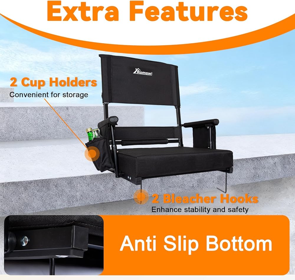 ميزات آمنة ومريحة: حافظ على استقرارك وتنظيمك. شرائط مضادة للانزلاق وخطافات سفلية تثبت المقعد بشكل آمن على المدرجات. حاملا أكواب وجيوب تخزين تجعل مشروباتك وهاتفك في متناول اليد، حتى تتمكن من التركيز على الاستمتاع بالحدث.