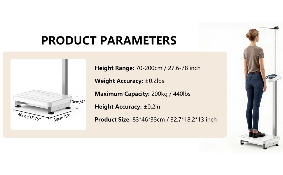 غرض مزدوج: يجمع بين ميزان منصة قوي وقضيب ارتفاع قابل للتعديل، مثالي للمكاتب الطبية أو مراكز اللياقة البدنية أو الاستخدام المنزلي.