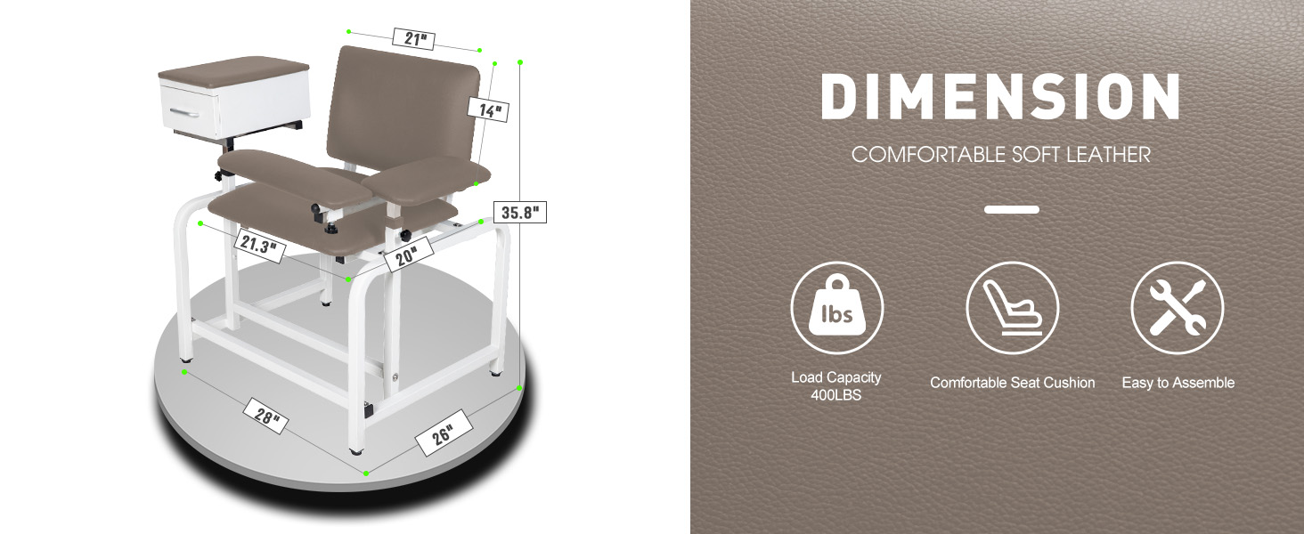 قوي ويدوم طويلاً: يضمن الإطار المصنوع من خليط معدني ثقيل المتانة. يبلغ مقاس كرسي سحب الدم المبطن هذا 91.44 سم ارتفاعًا × 71.12 سم طولًا × 66.04 سم عرضًا، وهو كبير بما يكفي لاستيعاب المرضى من مختلف الأحجام.