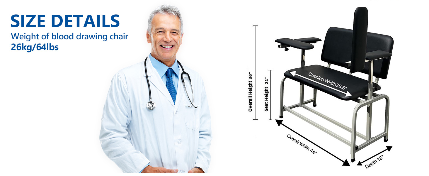 • ★كرسي سحب الدم المنجد المريح - قياس 38 بوصة ارتفاع × 18 بوصة طول × 44 بوصة عرض. مناسب لأنواع مختلفة من المرضى. إن الذراع القابل للطي ومساند الأذرع ومسند الظهر المقوس والمقعد المحيطي لكرسي سحب الدم هذا كلها مغطاة بطبقة سميكة من الحشو بسمك 2 بوصة، مما يوفر للمرضى تجربة سحب دم أكثر راحة.