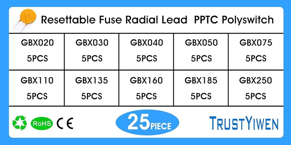 50pcs Resettable Fuse Radial Lead PPTC GBX-020 GBX-030 GBX-040 GBX-050 GBX-075 GBX-110 GBX-135 GBX-160 GBX-185 GBX-250 PPTC Polyswitch Assortment Kit