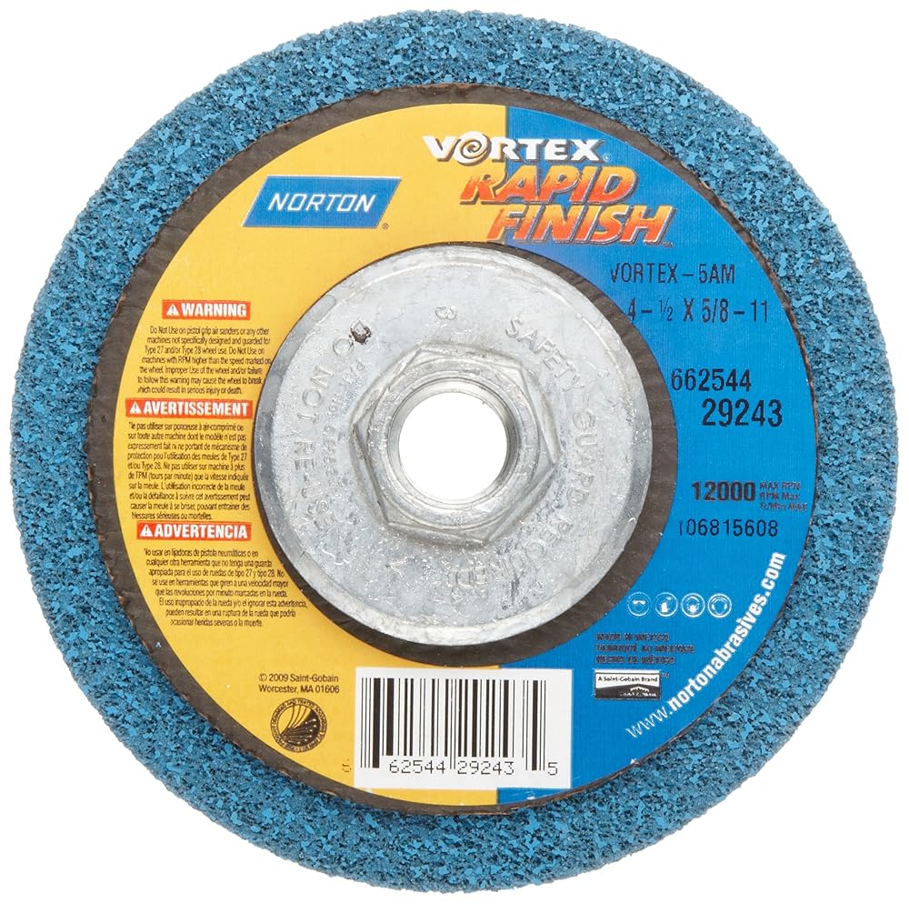 Price For: Each Diameter: 4-1/2" Wheel Type: Blending and Finishing Item: Depressed Center Wheel Max. RPM: 12, 000 Thickness: 1/2" Application: For Deburring and Finishing Type: Type 27 Abrasive Material: Aluminum Oxide Arbor Size: 5/8"-11 Series: Vortex Rapid Prep Grit: 60-80 Grade: Medium Country of Origin (subject to change): Mexico