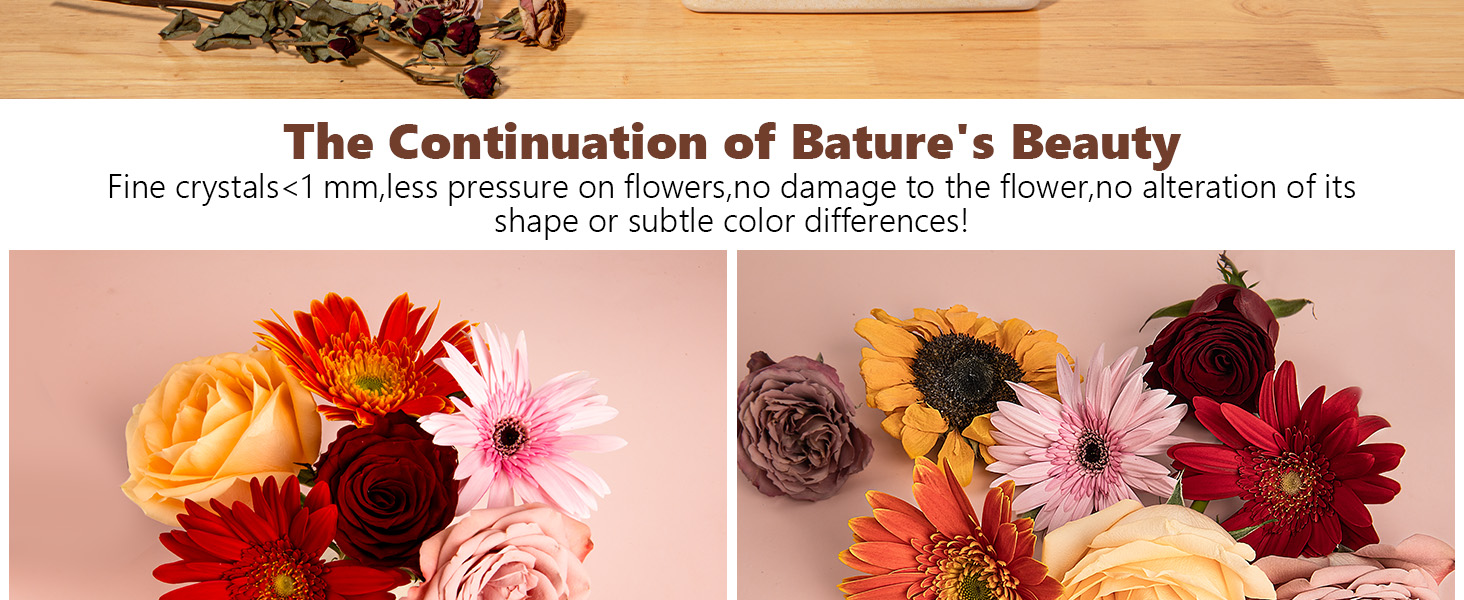 • ☀ 【كريستالات دقيقة بحجم مثالي】حجم جسيمات جل السيليكا الخاص بنا أقل من 1 مم، صغير وخفيف الوزن، ضغط منخفض لطيف على الزهرة يحمي الزهرة من التلف، ويطيل جمال الزهور، ويترك لحظة قيمة للحياة.