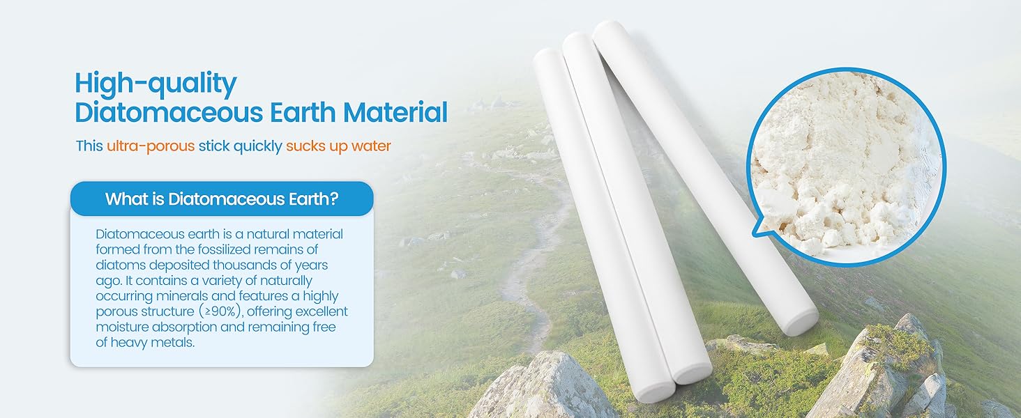 【أعواد دياتوم سريعة الامتصاص وقابلة لإعادة الاستخدام】مصنوعة من تراب دياتومي طبيعي مع مسام كثيفة، تمتص هذه العصي الرطوبة بسرعة وقابلة لإعادة الاستخدام (تجفف بالهواء لاستعادتها). مجموعة مكونة من 7 قطع تغطي مساحات متعددة في وقت واحد، وغير سامة، وآمنة للأطفال والحيوانات الأليفة.