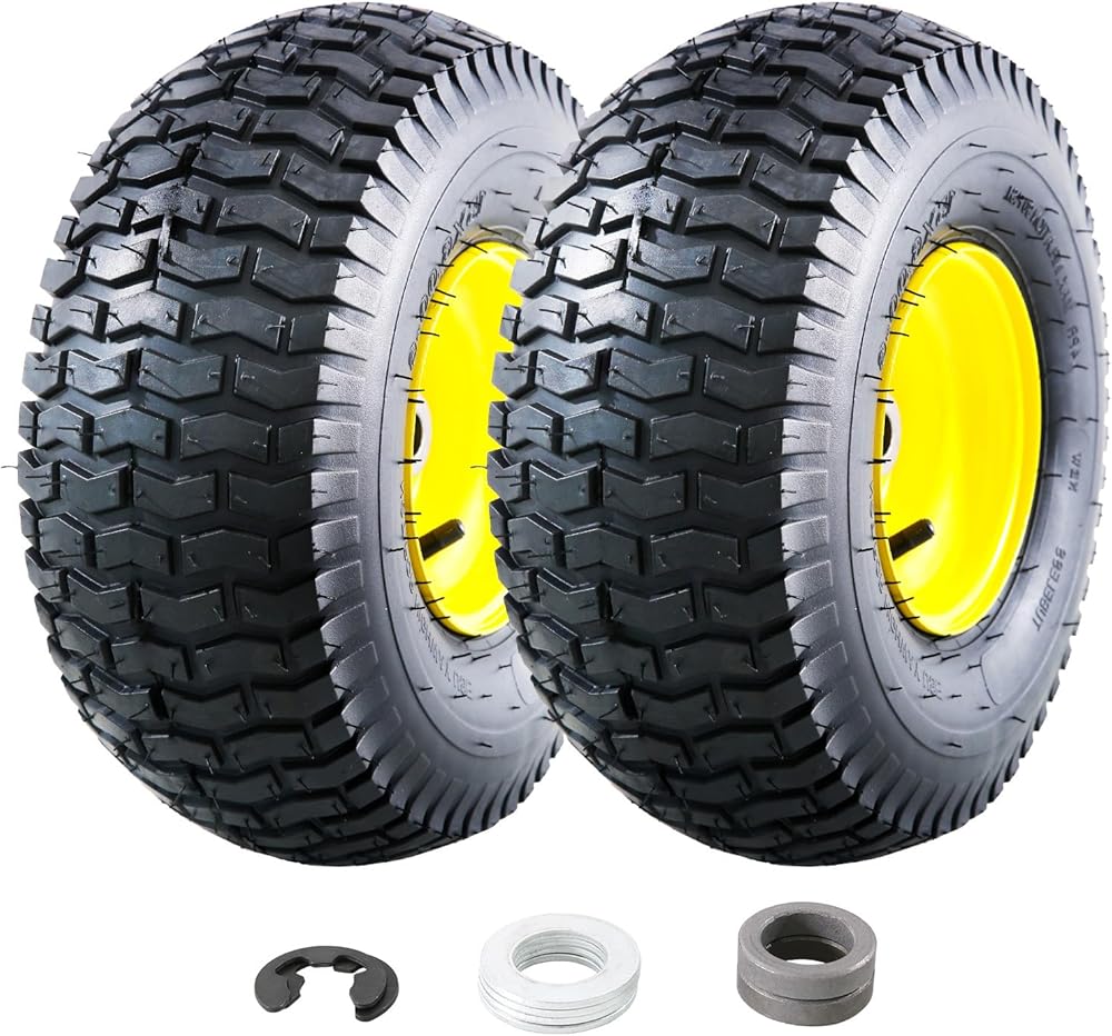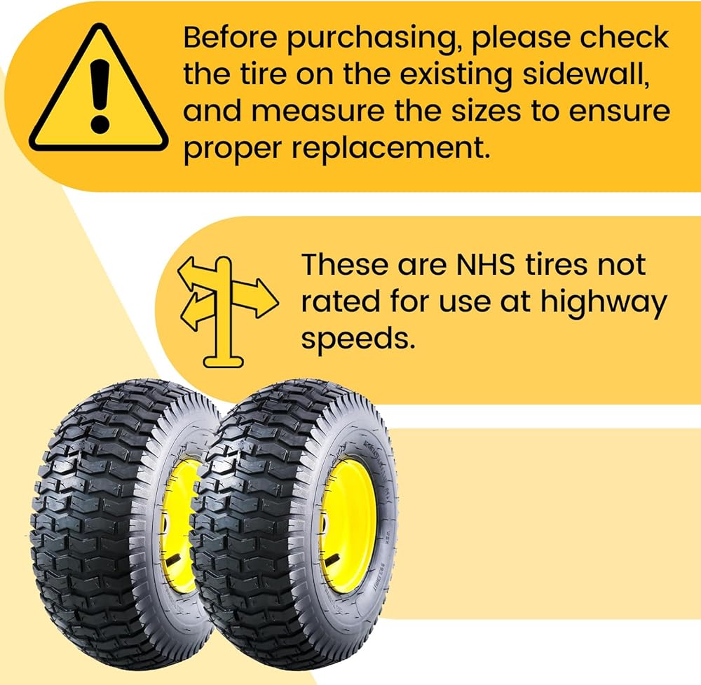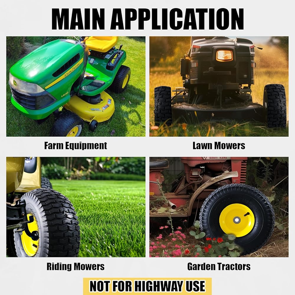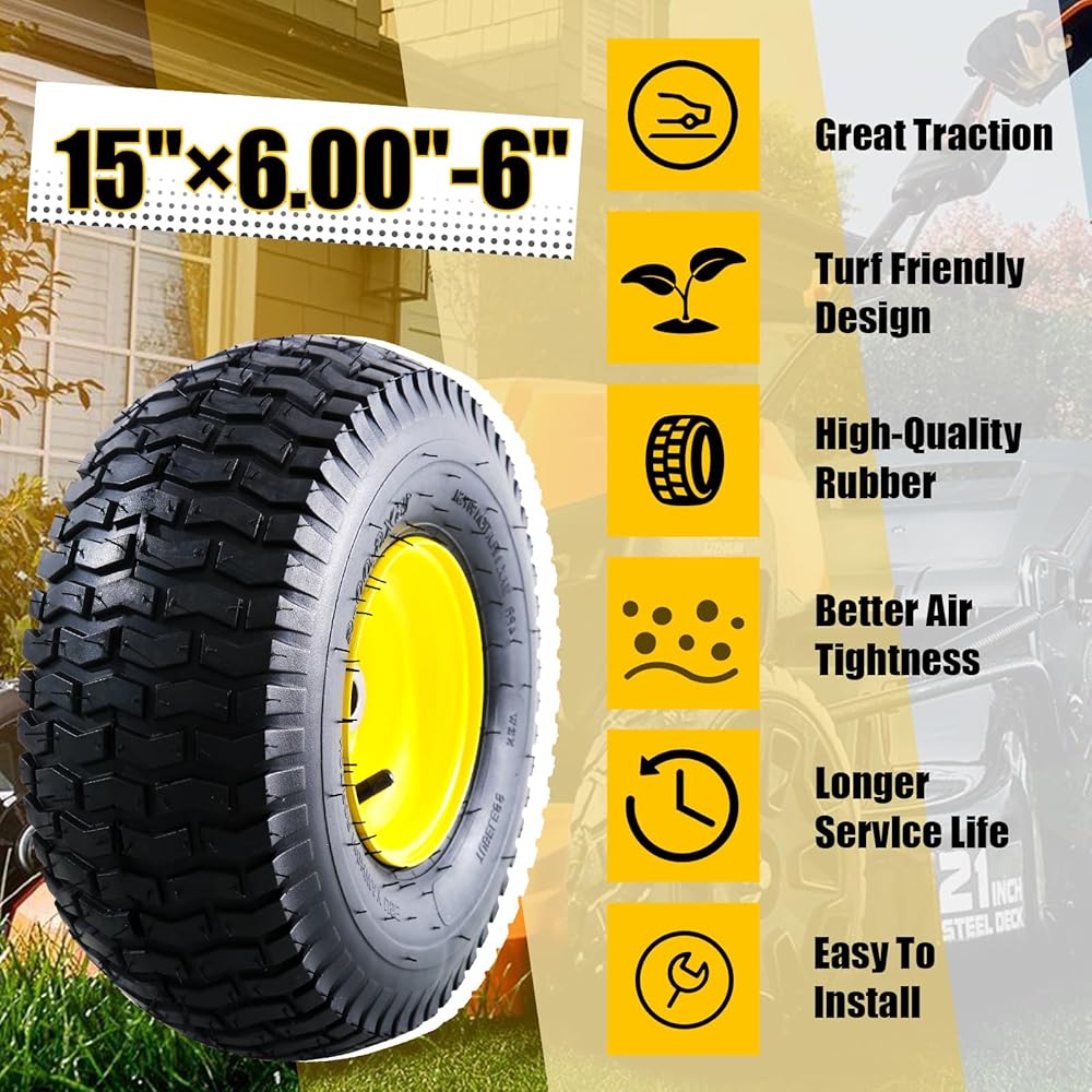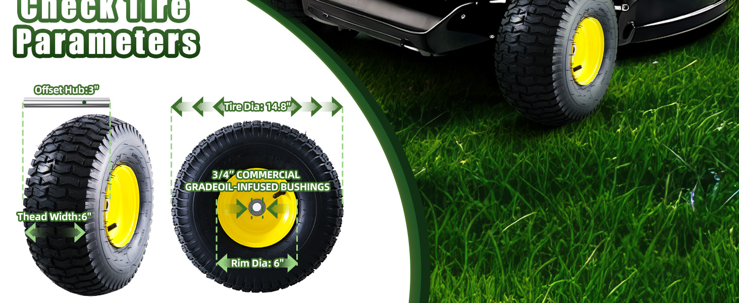 التوافق العالمي. إطارات جزازة العشب مقاس 15 × 6.00-6 هي الإطارات الأمامية المتوافقة مع معظم جزازات جون ديري (100، L100، LA100، D100، STX، E100، LT Series)، كما أنها متوافقة مع العديد من أنواع إطارات جزازة العشب، وإطارات جرارات العشب، وإطارات جرارات الحدائق، وإطارات سحب جرارات الحدائق، والمزيد. قبل الشراء، يرجى التحقق من الإطار الموجود على الجدار الجانبي الموجود وقياس حجم المحور والمحمل لضمان الاستبدال المناسب