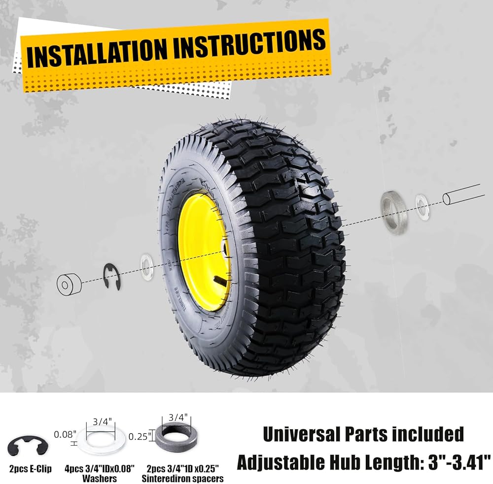 معلمات الإطارات. نموذج الإطارات والعجلات: 15x6.00-6 بدون أنبوب؛ قطر الإطار 14.8 بوصة؛ عرض الإطار: 6 بوصة؛ قطر المحمل: 3/4 بوصة؛ طول محور الإزاحة: 3 بوصة - 3.41 بوصة (قابل للتعديل مع مجموعة المحول المتضمنة)؛ سعة التحميل الديناميكي: 700 رطل، تصنيف 4 طبقات، الحد الأقصى للرطل لكل بوصة مربعة 30. ملاحظة: ليس للاستخدام على الطرق السريعة