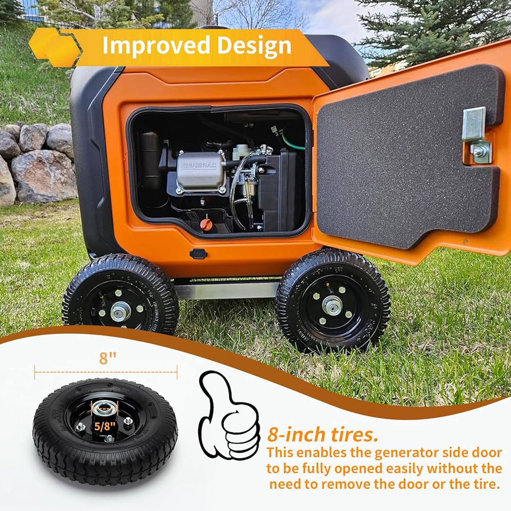 • [Precise compatibility]: Wheel kit Fit for GENERAC iQ3500 Generator.The 8-inch all-terrain wheels are widely used and can also replace your trolley tires, truck tires, trolley tires, garden vehicle tires.
