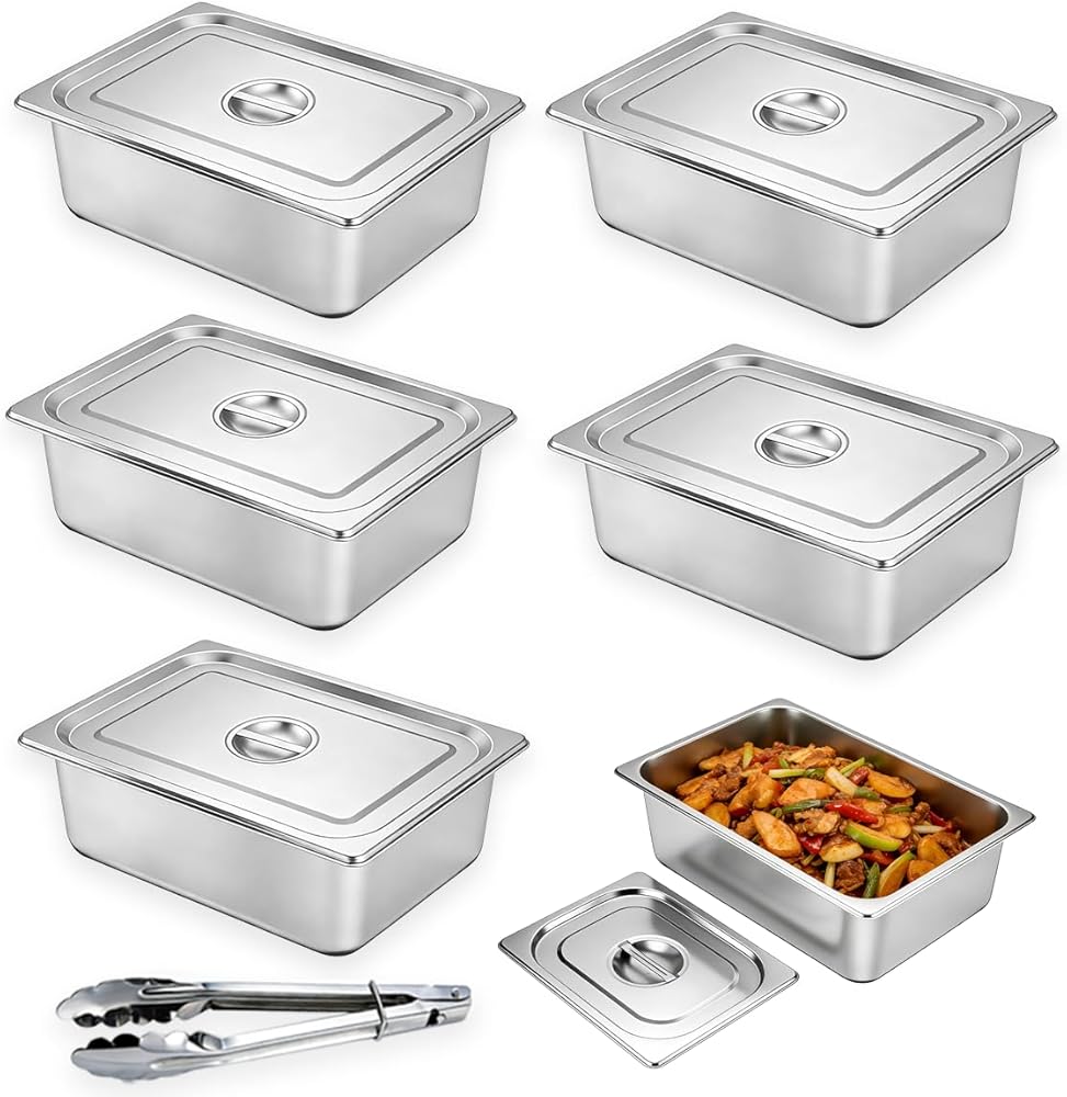 • Package Contents: Receive 5 packs of durable steam table pans (commercial grade hotel pans) with snug fitting lids,and then will gift one kitchen tongs ideal for keeping hot and cold foods fresh at parties, weddings, restaurants, cafeterias, and hotels.