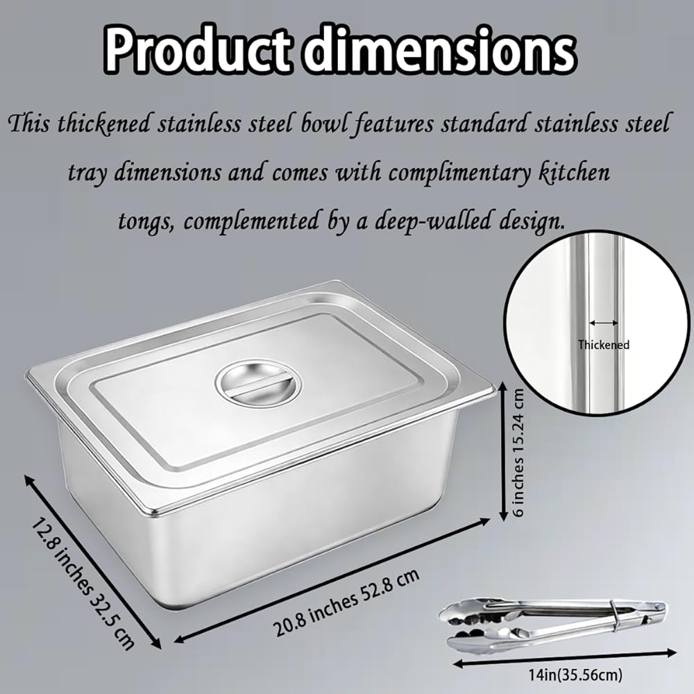 • Fit Size and Capacity: This full size hotel pan measures 20.8 x 12.8 x 6 inches,a standard stainless steel tray dimension offering deep, thick walls and ample space for commercial food storage, prepping, and serving large volumes at buffets.