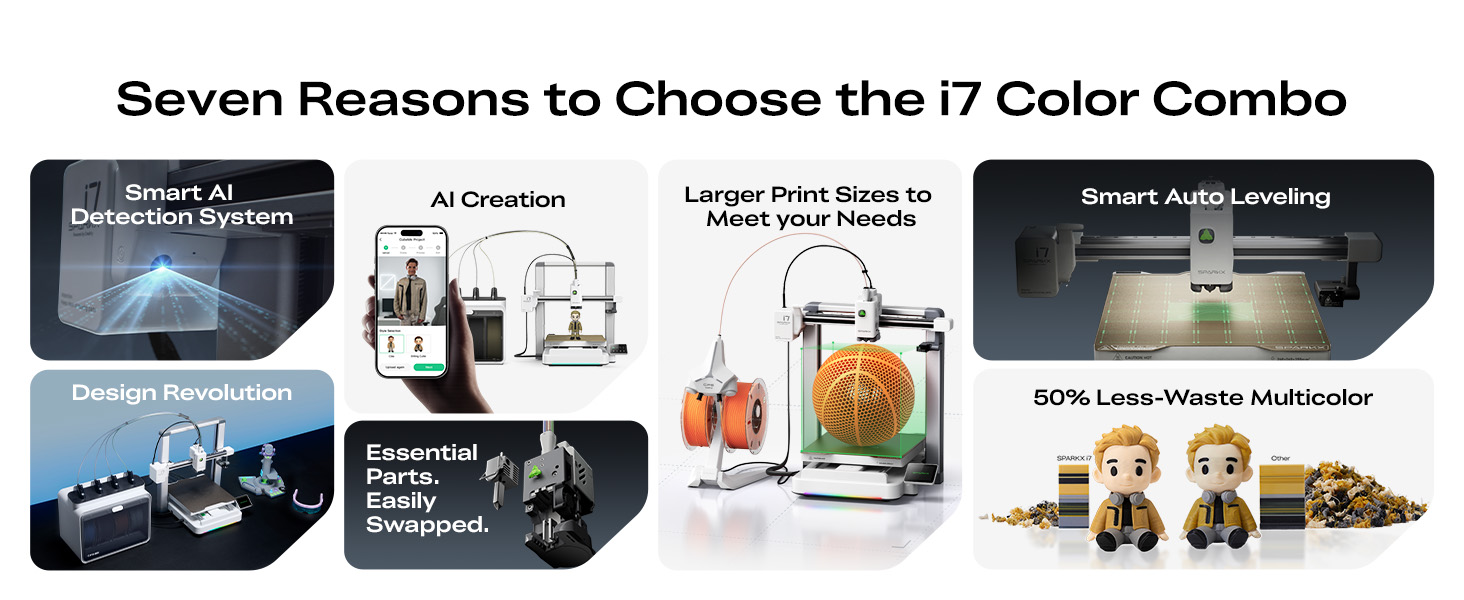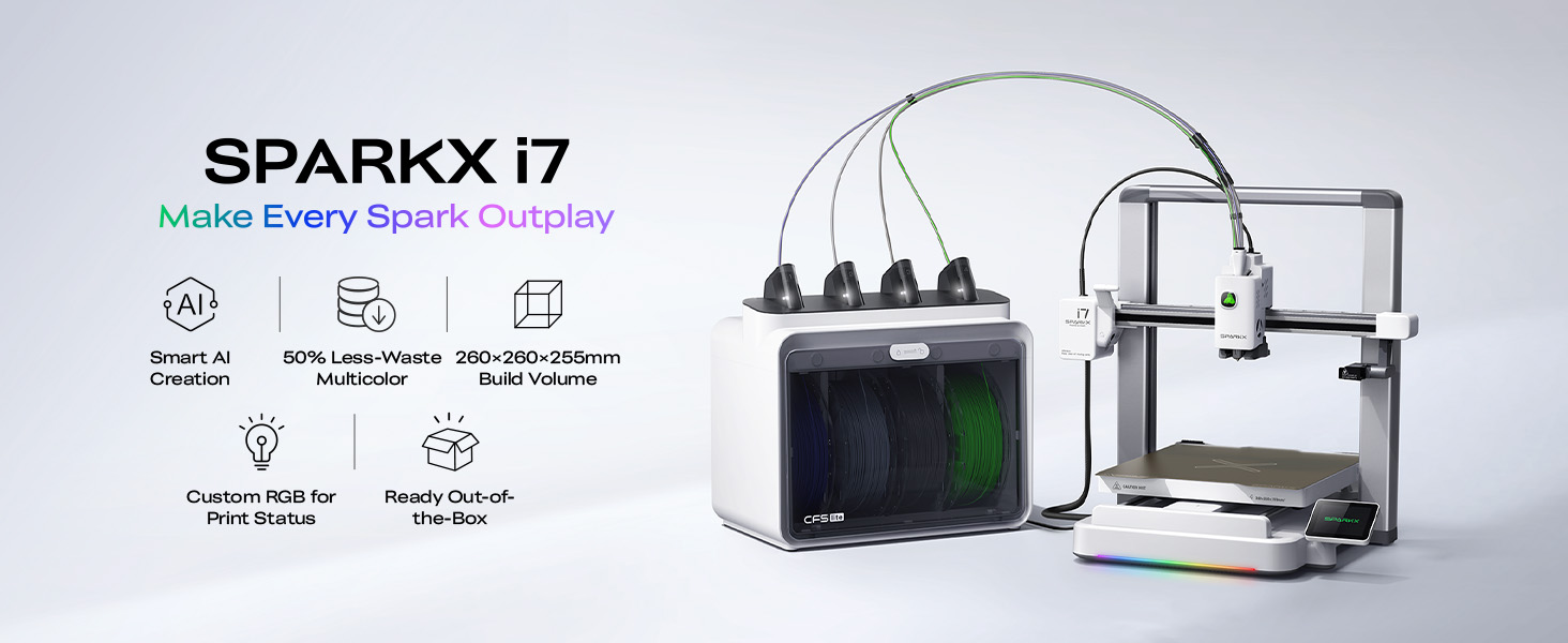طابعة Creality SPARKX I7 Combo ثلاثية الأبعاد، متعددة الألوان مع CFS Lite AI Photo to 3D Printing 500 مم/ثانية عالية السرعة وضبط تلقائي لضوء RGB 95% أجزاء أساسية مسبقة التجميع منخفضة الضوضاء 10.24 × 10.24 × 10 بوصة