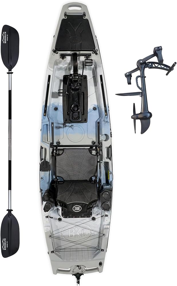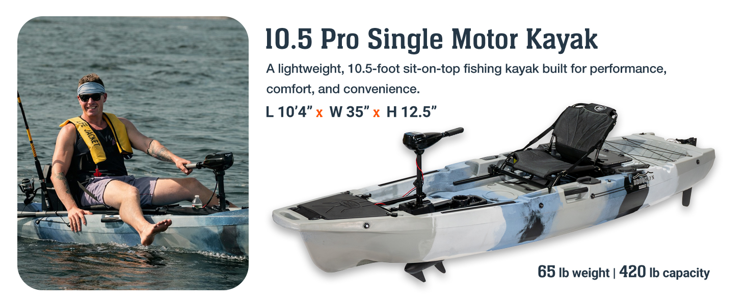 The Upgraded Brooklyn 10.5 Pro Pedal Kayak delivers premium-level features without the premium price tag. Designed as the next evolution of the popular PK11 platform, this upgraded model features a refined propeller pedal drive system that delivers smoother propulsion, improved efficiency, and reduced fatigue — allowing you to go farther with less effort. At only 65 lbs, it's significantly lighter than many competing pedal kayaks, making transport, loading, and launching easier for solo paddlers. Yet it maintains a strong 440 lb total capacity for you and your gear. The upgraded aluminum frame seat provides elevated comfort and improved visibility for fishing. The integrated rudder system enhances tracking and maneuverability, while multiple sealed storage hatches and a spacious rear cargo deck keep your gear organized and secure. Whether you're fishing lakes, cruising rivers, or exploring calm coastal waters, this upgraded 10.5 ft pedal kayak offers: Hands-free propulsion Lightweight transport Serious stability Motor-ready flexibility Exceptional value Premium performance — without premium pricing.
