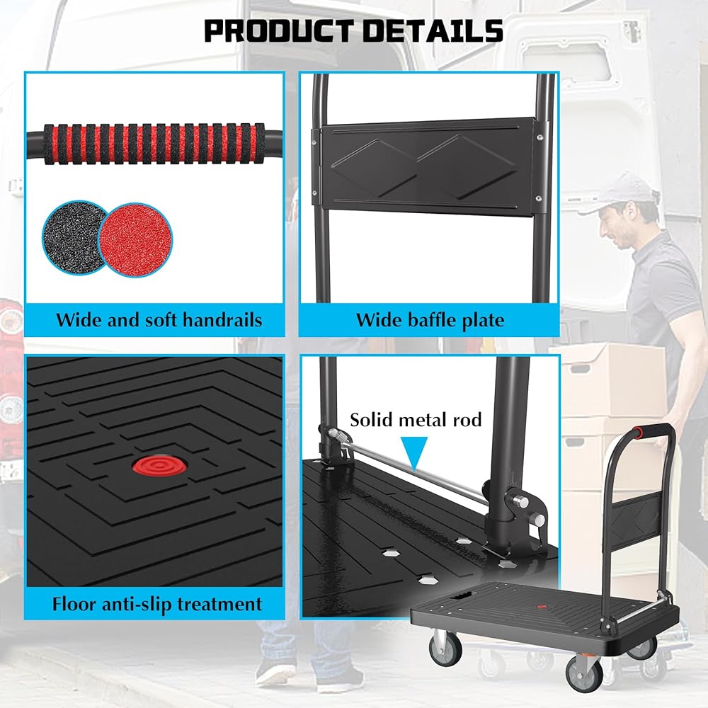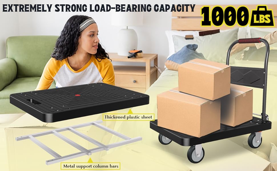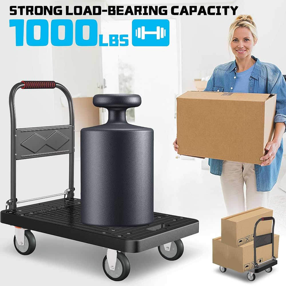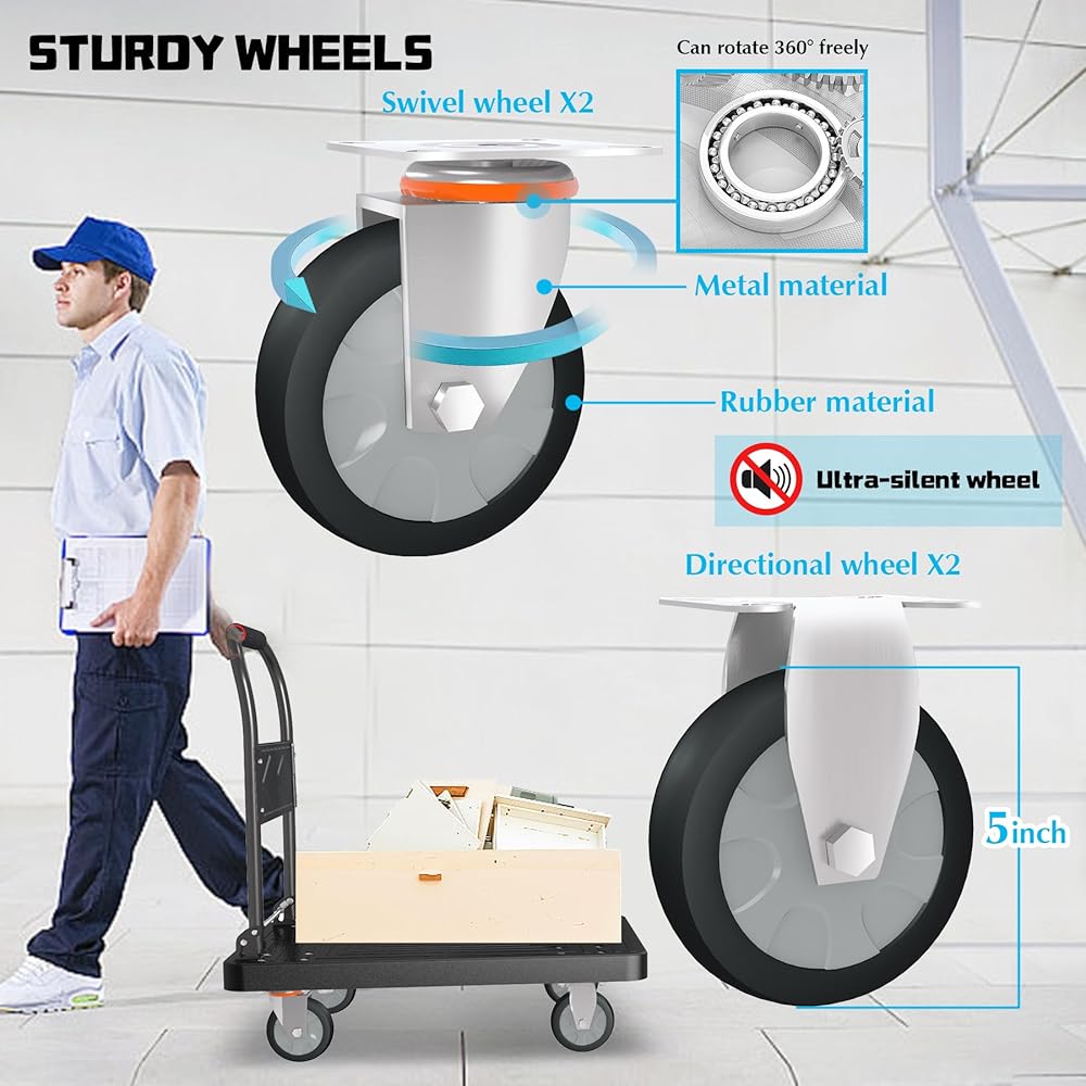 متينة وقوية: تتميز عربة الشاحنة ذات المنصة الخاصة بنا بسعة تحميل مذهلة تبلغ 1000 رطل مع هيكل حمل متين ومعزز. يمكنك الوثوق بها للتعامل مع أثقل العناصر لديك مع ضمان تجربة نقل سلسة