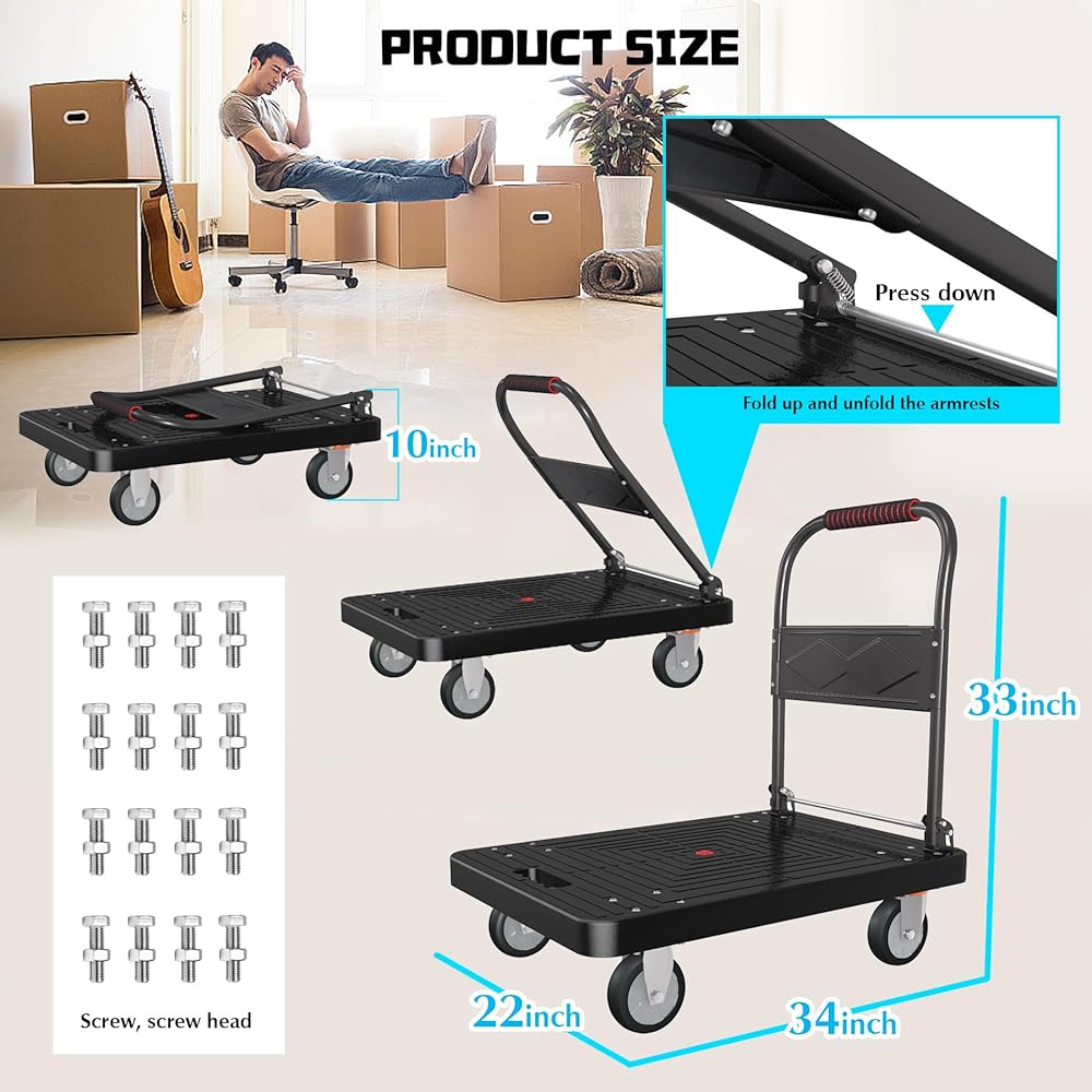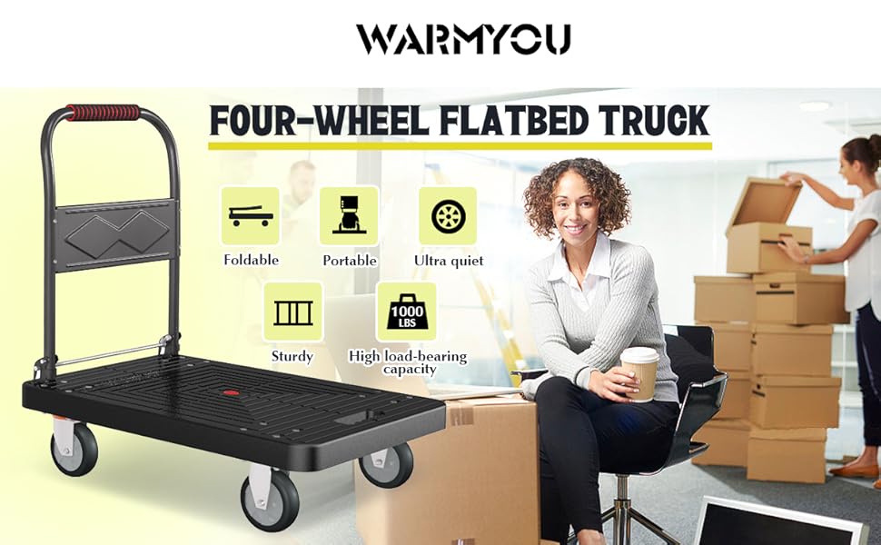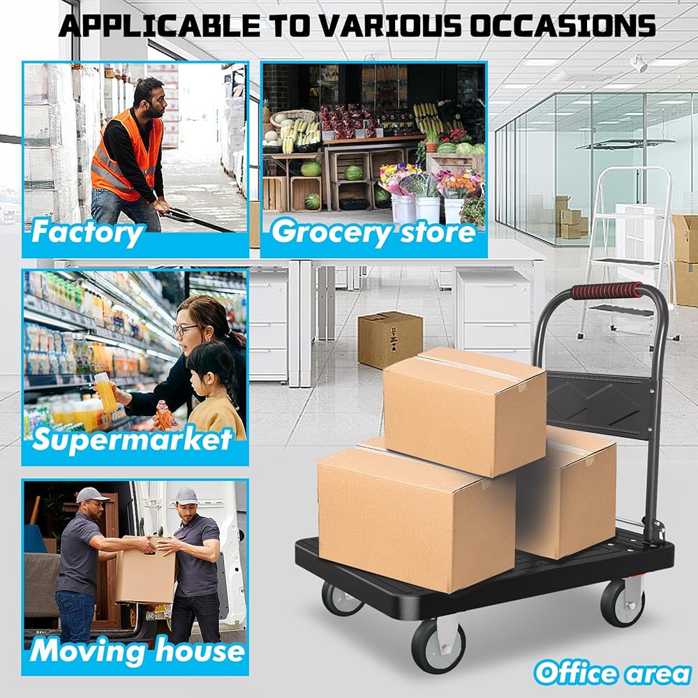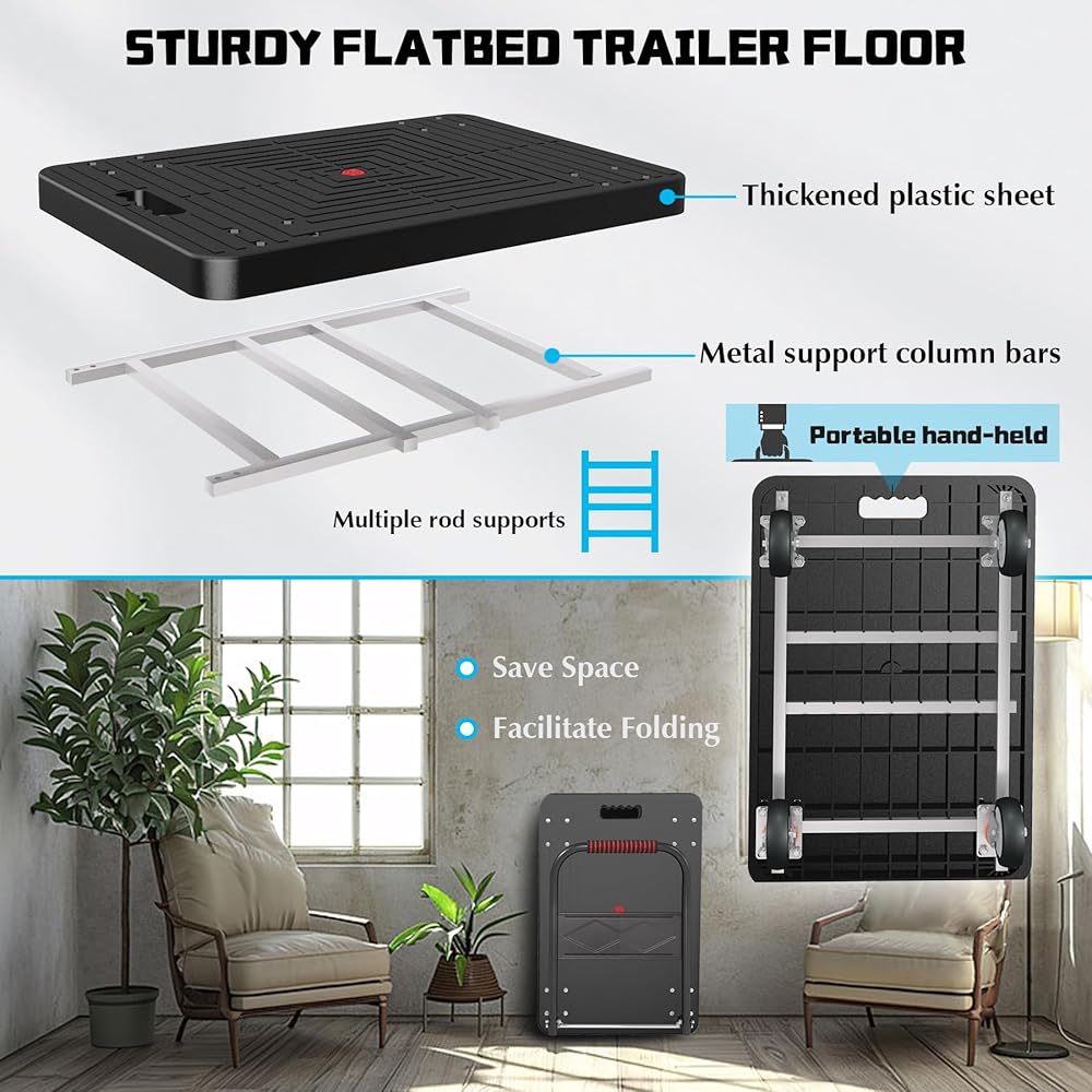 متينة وقوية: تتميز عربة الشاحنة ذات المنصة الخاصة بنا بسعة تحميل مذهلة تبلغ 1000 رطل مع هيكل حمل متين ومعزز. يمكنك الوثوق بها للتعامل مع أثقل العناصر لديك مع ضمان تجربة نقل سلسة