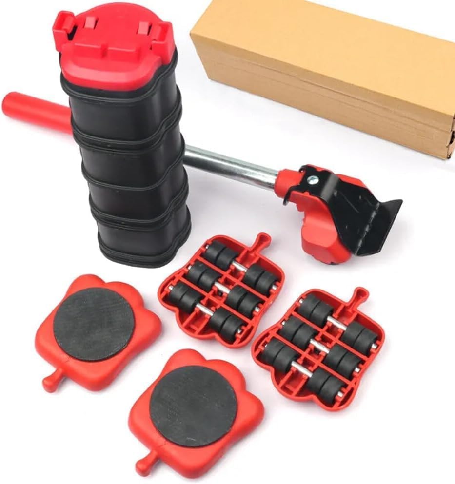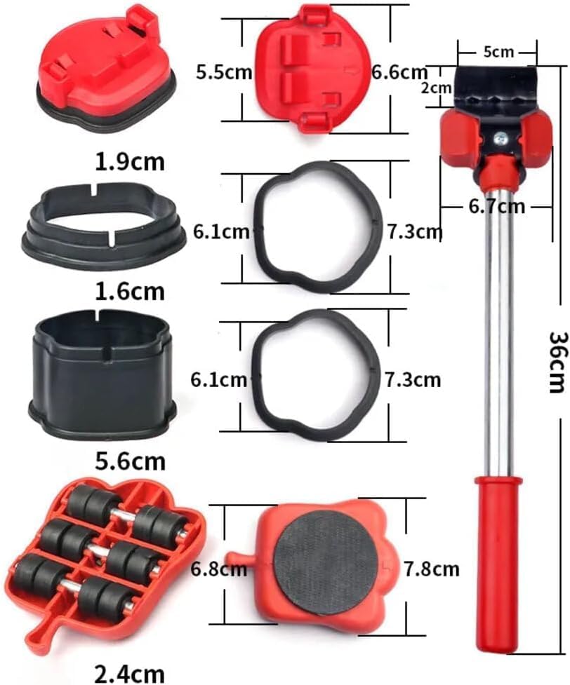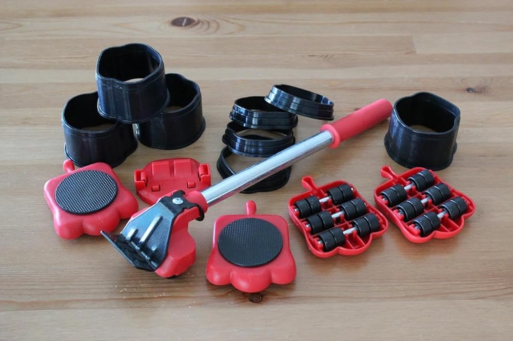 Lifter and mover provides a complete solution. The furniture movers with wheels Tool Set includes 1 pry bar, 4 roller plates with 6 wheels, and 7 height adjusters. Everything needed to lift and move furniture or appliances with ease. One person can use it easily either home user or professionals. Lifting and moving heavy and bulky items is not a problem.