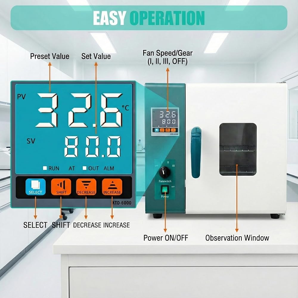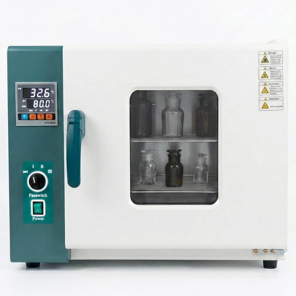 Designed for drying, baking, wax melting, heat treatment, and reheating of laboratory materials and equipment. Features a hot air circulation system with a separate fan switch for uniform heating and faster drying. Equipped with a digital PID temperature controller with timing, over-temperature alarm, temperature deviation correction, and self-tuning functions. Includes a top drainage hole for moisture removal, a synthetic silicone door seal, anti-slip feet, and double-row heat dissipation holes for safety and durability.