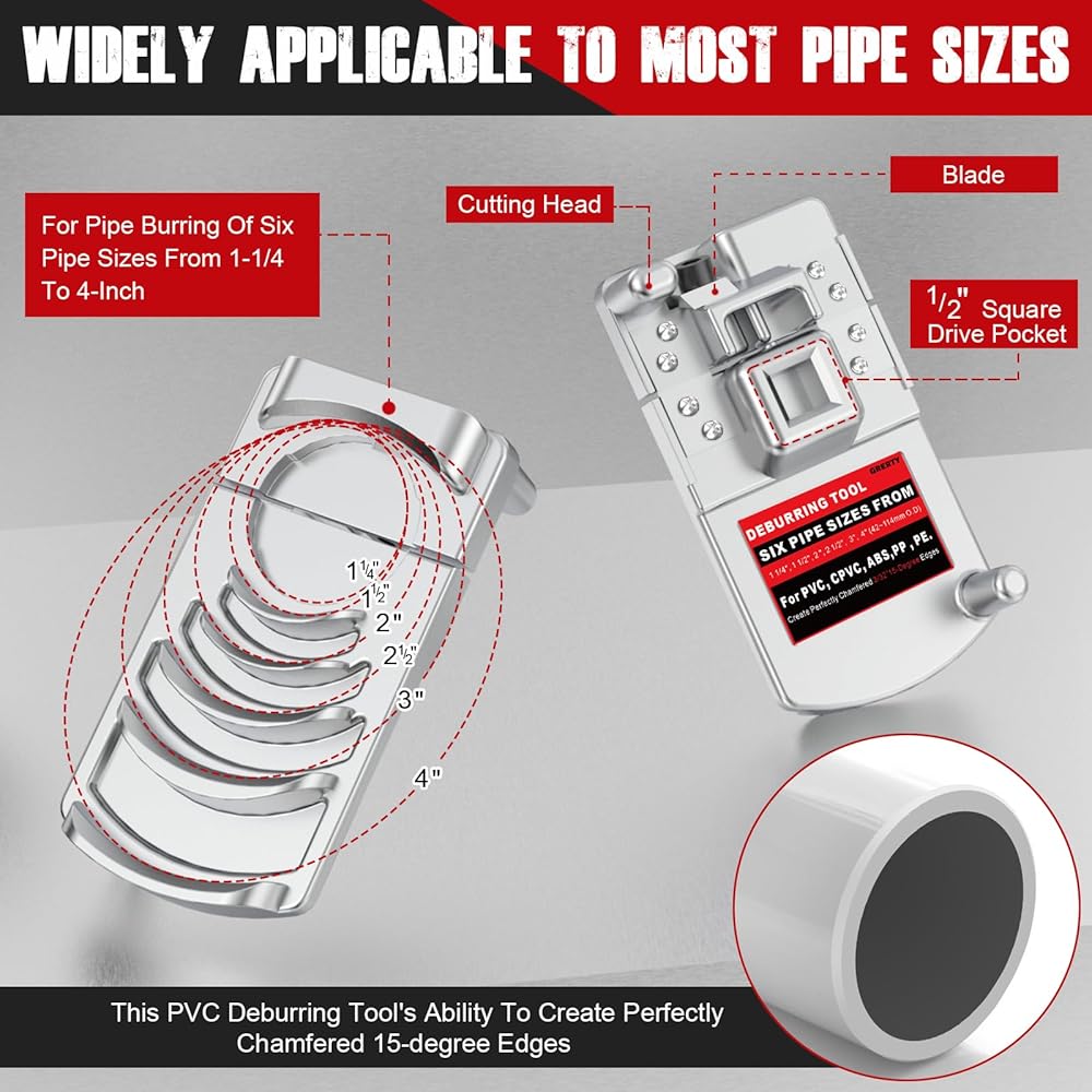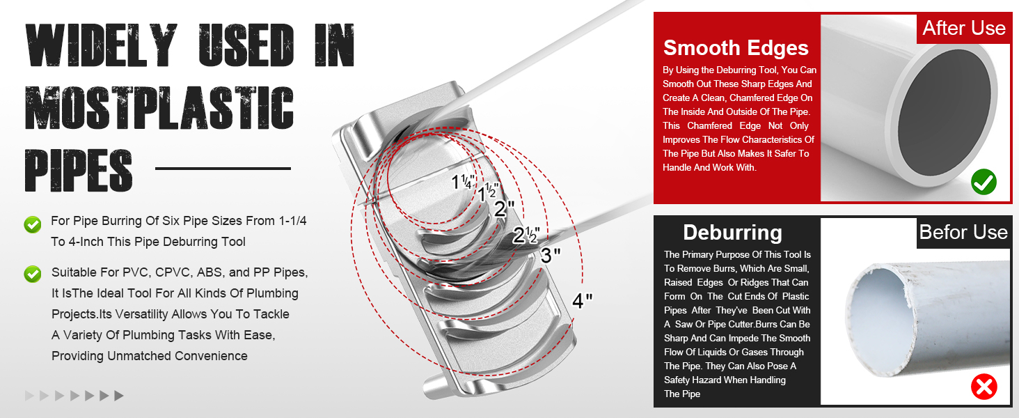 تستخدم على نطاق واسع في معظم الأنابيب البلاستيكية: لحرق الأنابيب من ستة أحجام من الأنابيب من 1-1/4 إلى 4 بوصة، أداة إزالة حواف الأنابيب هذه هي رفيقك الموثوق به للأنابيب من جميع الأحجام. مناسبة لأنابيب PVC وCPVC وABS وPP، وهي الأداة المثالية لجميع أنواع مشاريع السباكة. يتيح لك تعدد استخداماته التعامل مع مجموعة متنوعة من مهام السباكة بسهولة، مما يوفر راحة لا مثيل لها