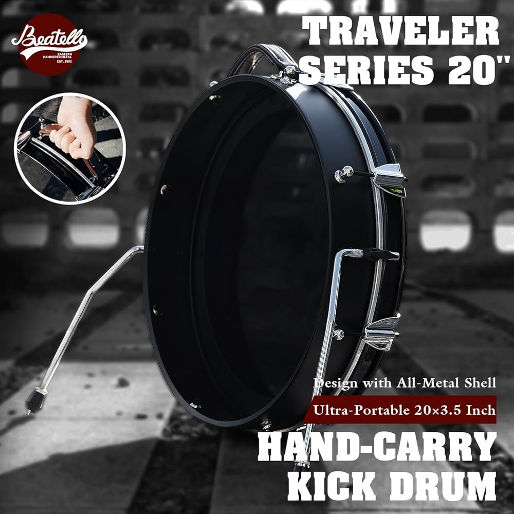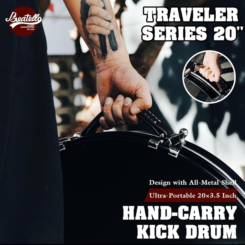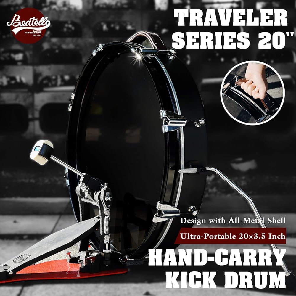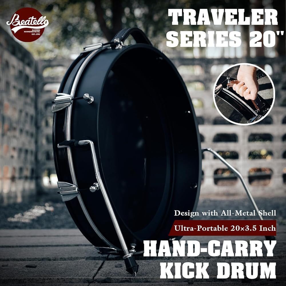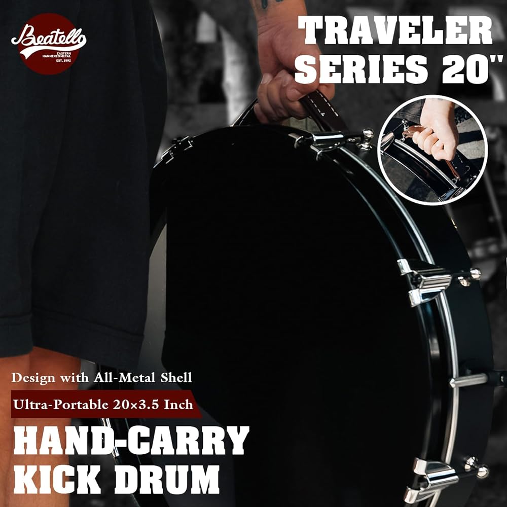 Revolutionize Your Rhythm with the Traveler Series 20" Ultra-Portable Kick Drum. Tired of lugging around a massive 22-inch bass drum for a 30-minute acoustic set? The Traveler Series 20" is the ultimate solution for the modern drummer who refuses to sacrifice sound for mobility. Why Choose the Traveler Series? Standard bass drums are bulky and fragile. Our 20x3.5 inch design redefines portability. By using an All-Metal Shell, we've created a drum that isn't just lighter and thinner, but also incredibly tough. It produces a tight, controlled "thump" that cuts through the mix, making it perfect for jazz, pop, busking, and hybrid percussion setups. Key Features: Space-Saving: At only 3.5 inches deep, it stores easily in a closet, a car trunk, or even behind a sofa. Durable Performance: The metal shell resists humidity and temperature changes, staying in tune longer than wood shells during outdoor performances. Hand-Carry Convenience: Designed to be grabbed and gone. It's the ultimate "gig-bag-friendly" kick drum. Specifications: Diameter: 20 inches Depth: 3.5 inches Material: Reinforced Metal Shell Finish: Polished Industrial Chrome Matte Black Package Includes: 1 x Traveler Series 20" Kick Drum (Pedal not included).