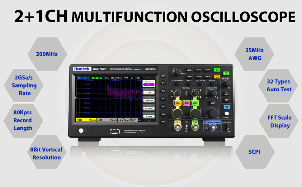المعلمات الأساسية: قناة مزدوجة، معدل أخذ العينات 2 GS/s، عرض النطاق الترددي 200 ميجاهرتز؛ الحد الأقصى لعمق التخزين 80 كيلوبت في الثانية (قناة واحدة) و40 كيلوبت في الثانية (قناة مزدوجة)؛ النطاق الأساسي الزمني: 2 ns/div إلى 1 kS/div؛ دعم تبديل المعاوقة 1 MΩ/50 Ω لضمان سلامة الإشارة؛ دقة رأسية 8 بت؛ ترس قياس عمودي 500 UV-10 V، 300 VCAT Ⅱ يتحمل مدخلات الجهد