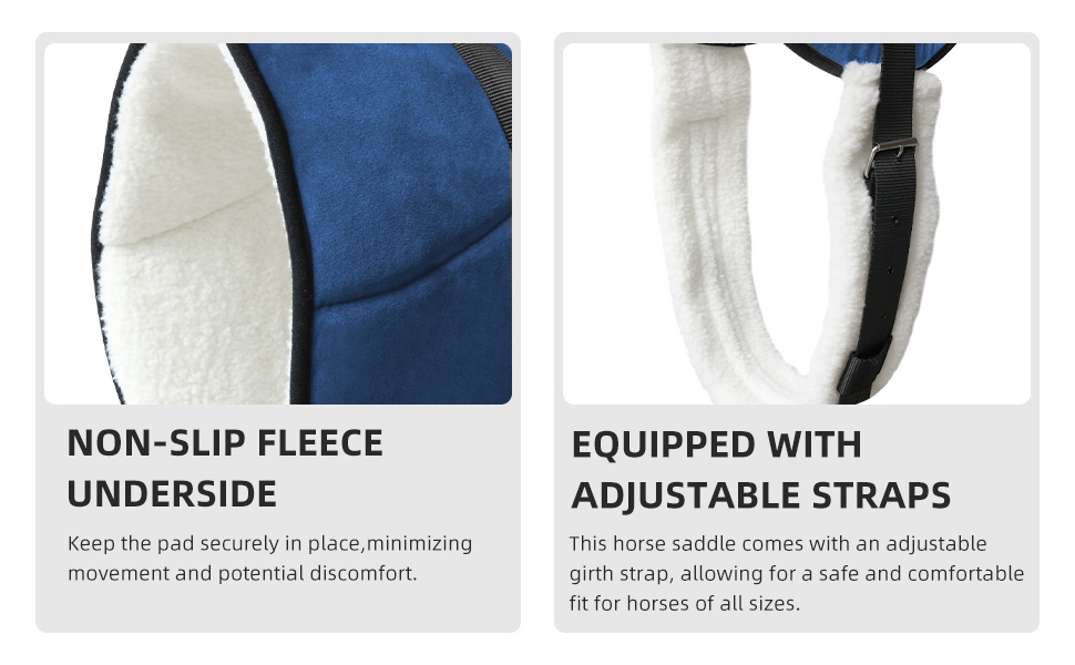 【وسادة مريحة ممتصة للصدمات】: مصممة مع وضع صحة الحصان في الاعتبار، تتميز وسادة سرج الحصان هذه بإسفنج سميك ممتص للصدمات لتقليل الضغط على ظهر الحصان. بطانة من الصوف الناعم توفر بطانة إضافية، مما يعزز الراحة العامة لكل من الحصان والفارس