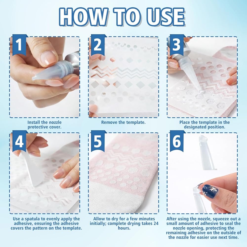 سهل التشغيل: احصل على نتائج احترافية في دقائق: 1) نظف السطح. 2) ضع الاستنسل. 3) ضع الغراء وانتشر بالتساوي. 4) دعها تجف. يتم التثبيت الأولي خلال 10 دقائق، ويتم العلاج الكامل خلال 3-12 ساعة. يمكنك بسهولة استعادة أو إنشاء نقاط مضادة للانزلاق على أي قماش.