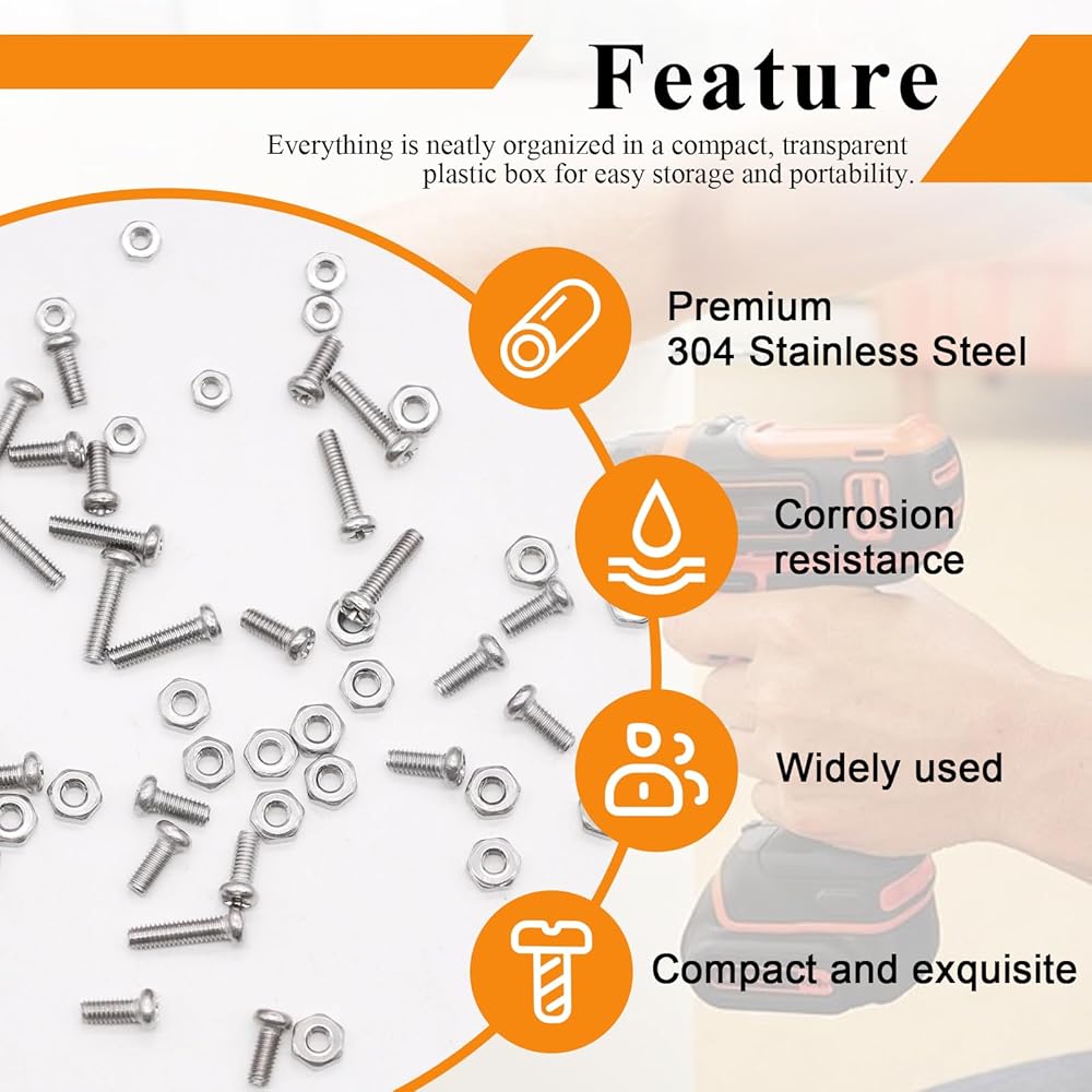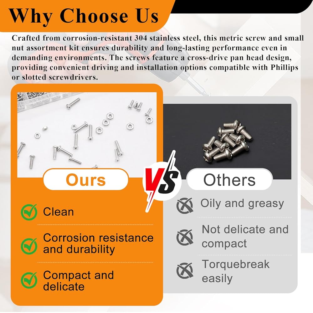 الفولاذ المقاوم للصدأ 304 الفاخر: مصنوع من الفولاذ المقاوم للصدأ 304 المقاوم للتآكل، يضمن هذا المسمار المتري ومجموعة متنوعة من الصواميل الصغيرة المتانة والأداء طويل الأمد حتى في البيئات الصعبة. تتميز البراغي بتصميم رأس عمومي متقاطع، مما يوفر خيارات قيادة وتركيب مريحة متوافقة مع مفكات فيليبس أو مفكات البراغي المشقوقة.