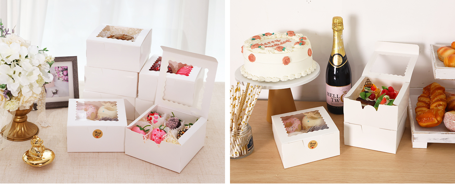 استخدام واسع: صناديق المخبوزات هذه مثالية لمختلف المناسبات مثل العطلات وحفلات الزفاف وأعياد الميلاد والحفلات. إنها رائعة لعرض السلع المخبوزة أو صنع مجموعات هدايا مخصصة مع ديكورات DIY.