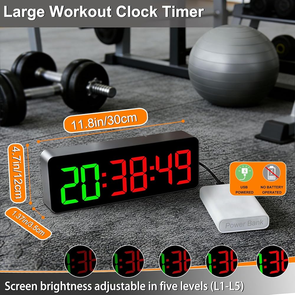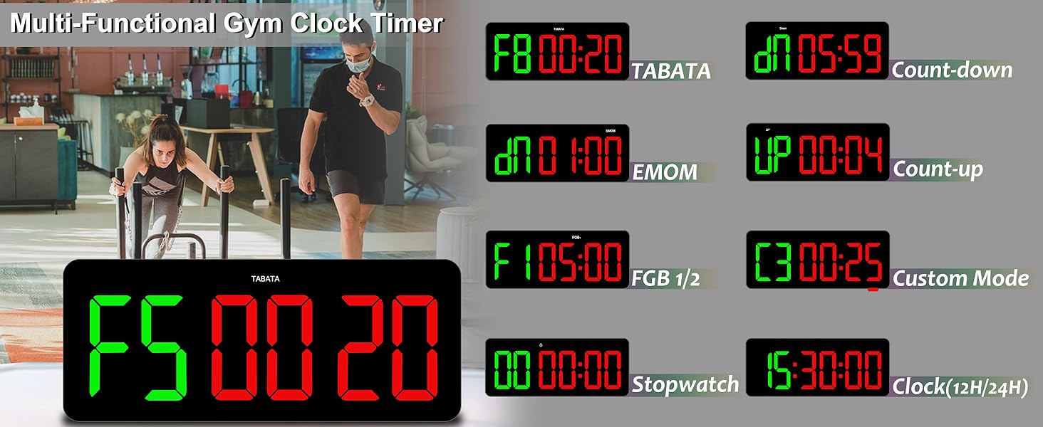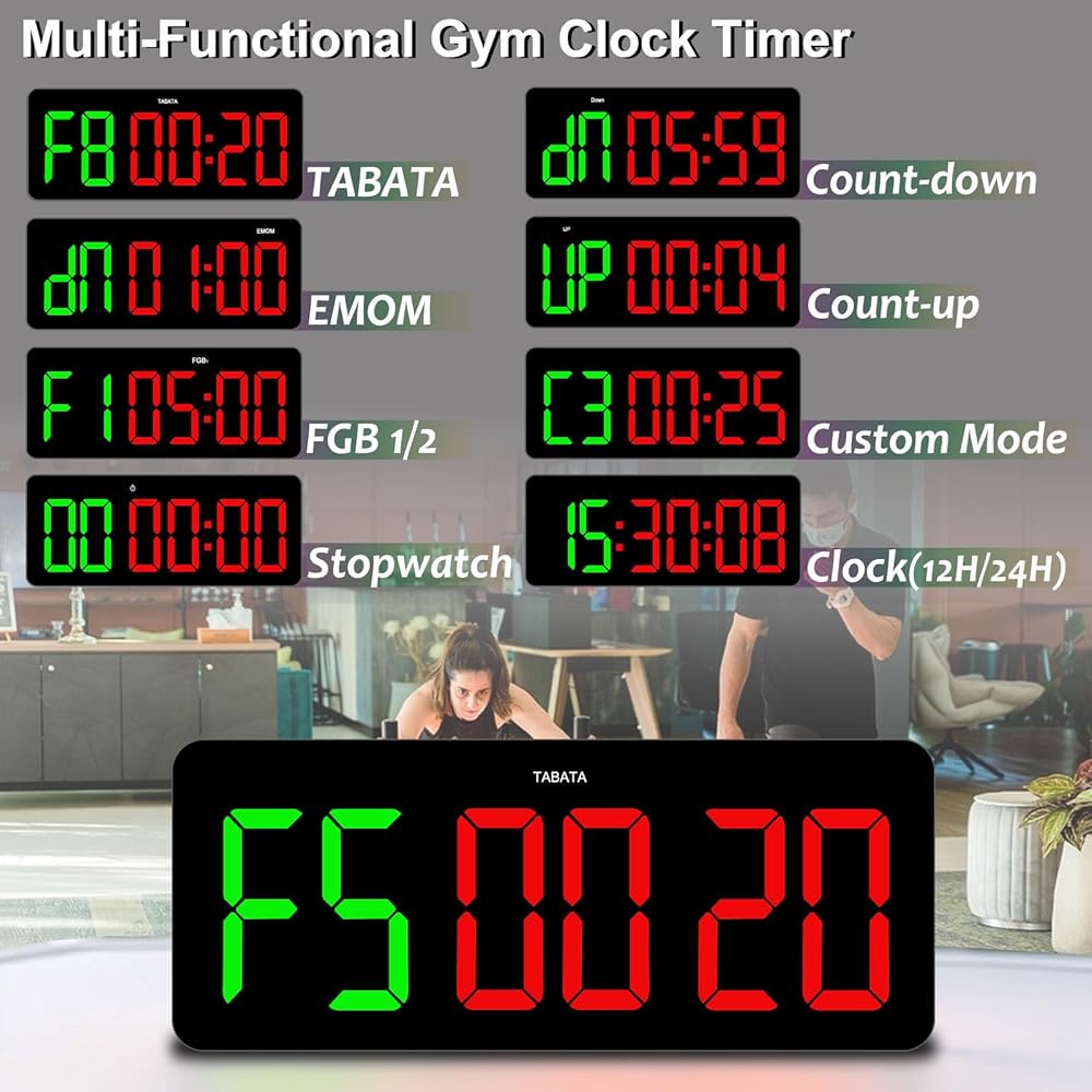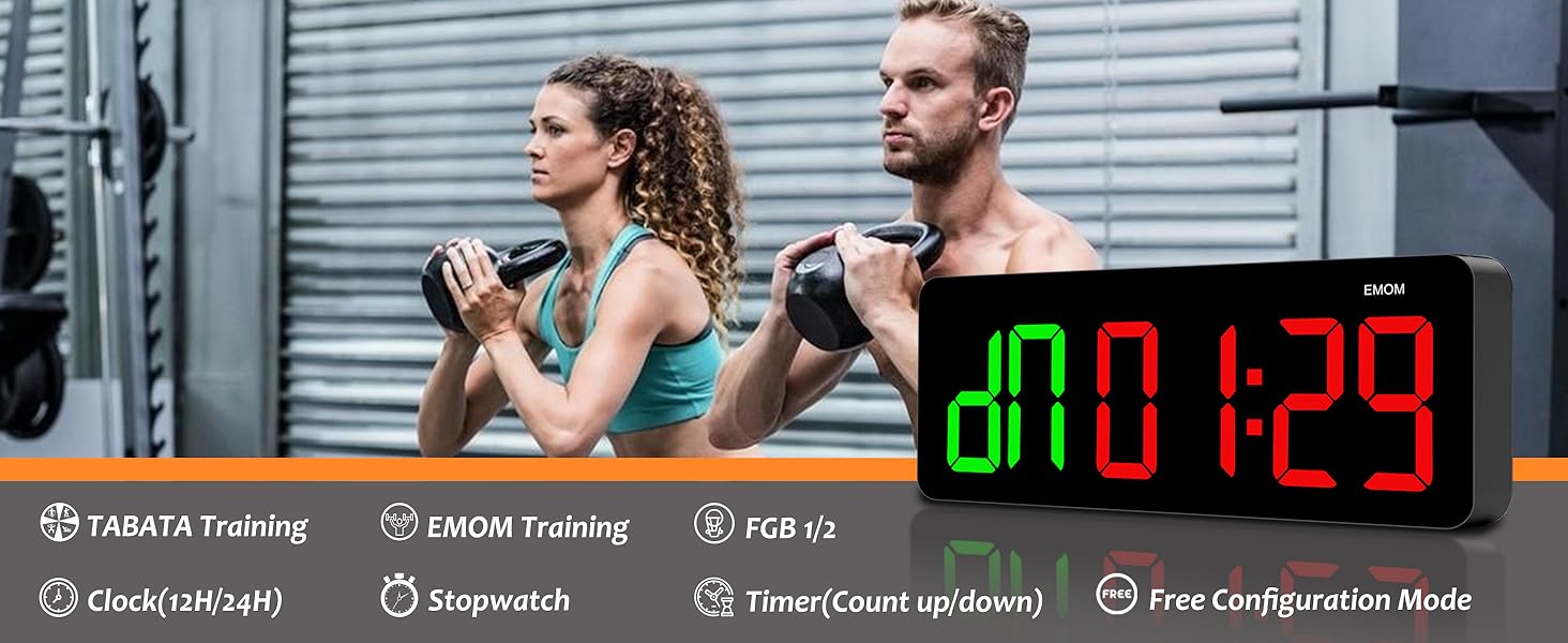 مؤقت وساعة رقمية 2 في 1 ------ إنها ليست مجرد مؤقت للياقة البدنية ولكنها أيضًا ساعة عملية، تعرض الساعات والدقائق والثواني بتنسيقات 12/24 ساعة قابلة للتبديل لحفظ الوقت اليومي. سطوع قابل للتعديل، وصوت عالي قابل للتبديل. يمكن تشغيل/إيقاف الشاشة عن طريق جهاز التحكم عن بعد دون تعطيل وظيفة الساعة، مما يجعلها مثالية لغرف النوم لتجنب تشتيت انتباهك أثناء النوم. بفضل مطابقة الألوان المنسقة والخطوط الكبيرة، فإنه يمزج بين فائدة التمرين وضبط الوقت اليومي وسهولة الحمل وسهولة الاستخدام بسلاسة
