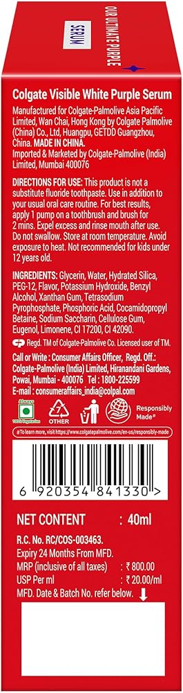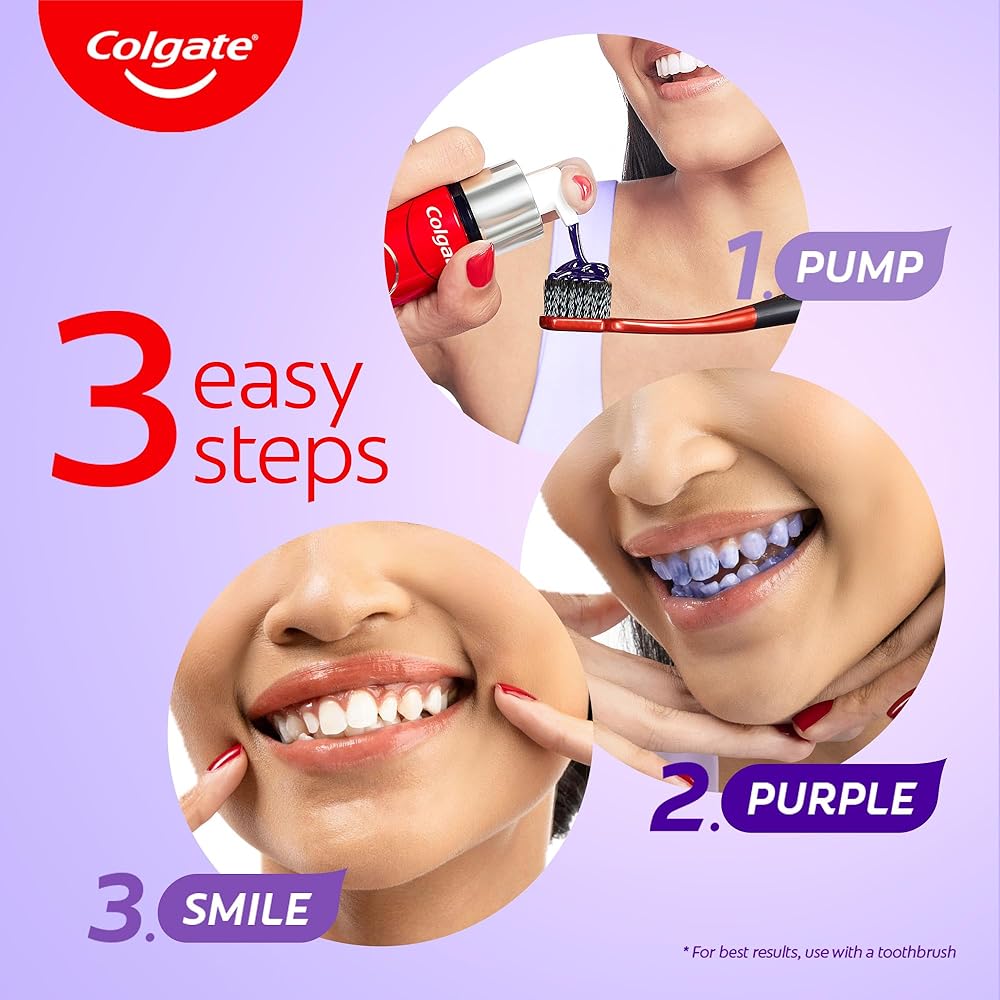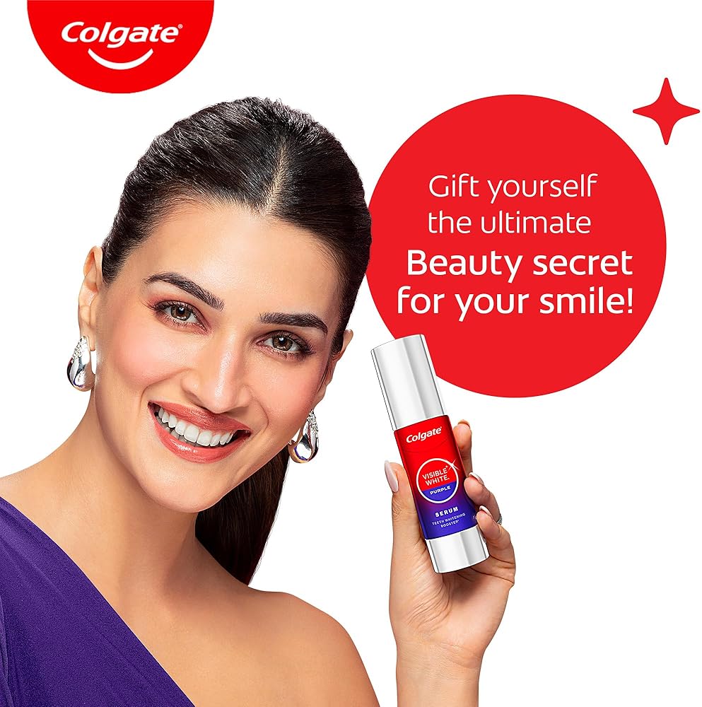 Unlock a whiter smile instantly with the Colgate Visible White Purple Teeth Whitening Serum. Inspired by colour theory, this 40ml purple serum for your teeth is developed & inspired by color theory and uses this to neutralize yellow tones in seconds, revealing a whiter, more radiant smile. Formulated with advanced purple brighteners and clinically tested technology, it provides superior color-correction and effective surface stain removal. Perfect for last-minute touch-ups, the enamel-safe formula is gentle enough for daily use. With its convenient pump and refreshing Mint & Yuzu flavor, this Visible White Purple teeth whitening serum is your essential beauty tool for a whiter confident smile anytime, anywhere!