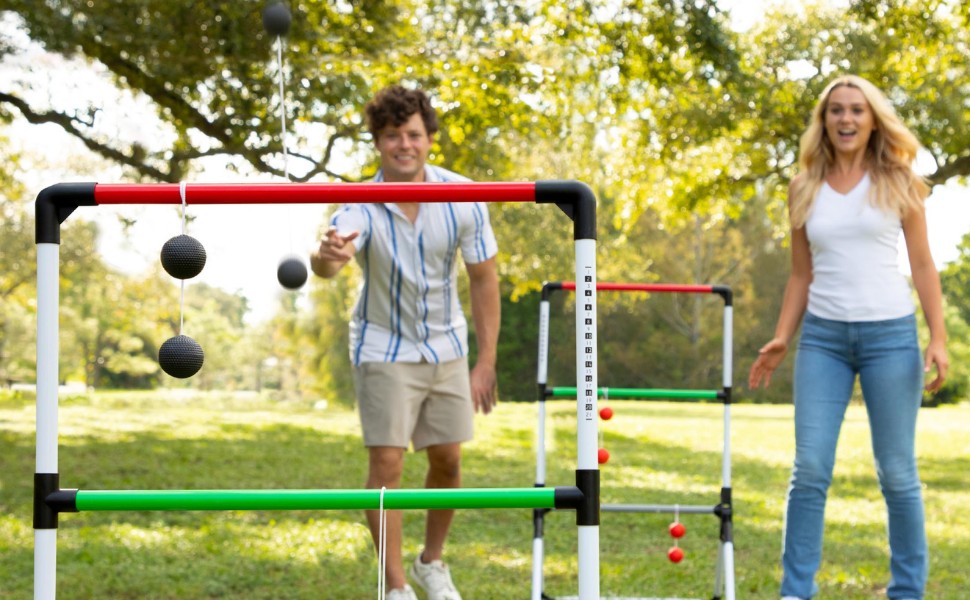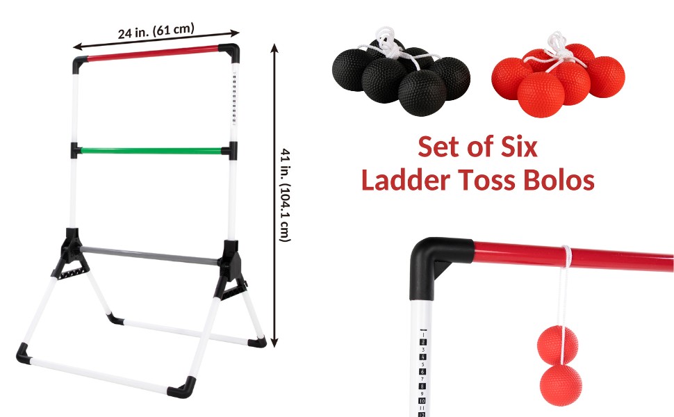 This MD Sports foldable outdoor ladder toss game set delivers fun for family, friends, and competitive players anywhere. Built with durable PVC and a weighted base for stability, it withstands both indoor and outdoor play. The foldable frame and included storage bag make it portable and easy to store, while quick no-tool assembly ensures hassle-free setup. With built-in scoring, weather-resistant targets, and six team-colored bolos, this compact 41 in x 24 in x 27 in game set is perfect for tailgates, camping trips, backyard parties, or casual game nights.
