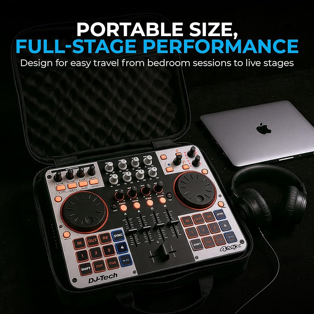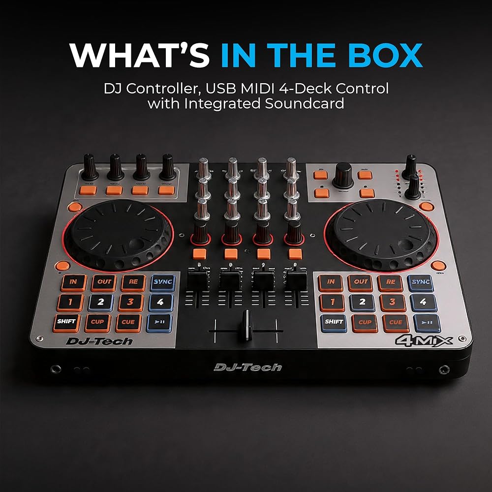 Meet the DJ Tech 4Mix—your streamlined path to 4-deck mixing. A USB MIDI design with an integrated soundcard simplifies setup, while the full 4-channel mixer section, EQs, and filters keep core controls at your fingertips. Large illuminated pads make cue juggling and looping immediate, and dedicated FX buttons with big knobs give you hands-on command of effects and parameters. Deck select buttons switch between A/B/C/D instantly for fast layering and transitions. The 4Mix includes VirtualDJ LE to get you mixing right away and remains fully mappable to other leading platforms. It's a portable solution that combines dj controller convenience with a familiar dj mixer layout and the performance feel of dj equipment—from a capable dj mixer board workflow to techniques inspired by a dj turntable setup.