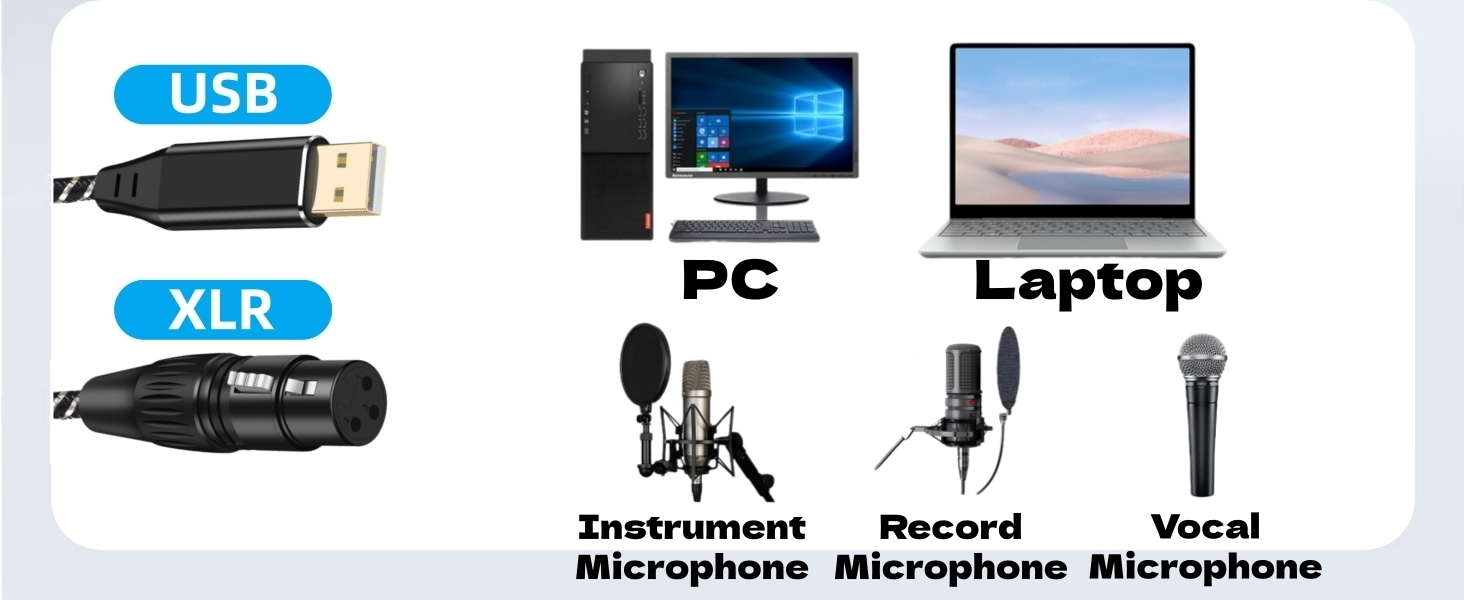 يرجى ملاحظة: كابل الصوت XLR إلى USB أحادي الاتجاه ويمكن استخدامه فقط لإخراج أجهزة موصل أنثى XLR إلى الصوت من أجهزة الكمبيوتر المحمولة وأجهزة الكمبيوتر الشخصية وما إلى ذلك. عند استخدام كابل USB إلى XLR لتوصيل ميكروفون مكثف، تكون هناك حاجة إلى طاقة فانتوم. ستعمل الميكروفونات الديناميكية بشكل طبيعي بدونها.