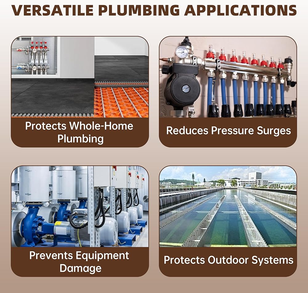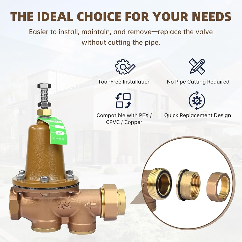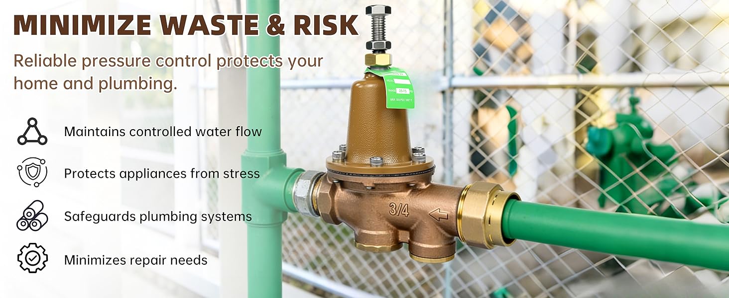 أداء ضغط المدخل العالي: تم تصميمه للتعامل مع ضغوط المدخل التي تصل إلى 300 رطل لكل بوصة مربعة مع الحفاظ على الضغط المتسق في اتجاه مجرى النهر لأنظمة السباكة المنزلية.
