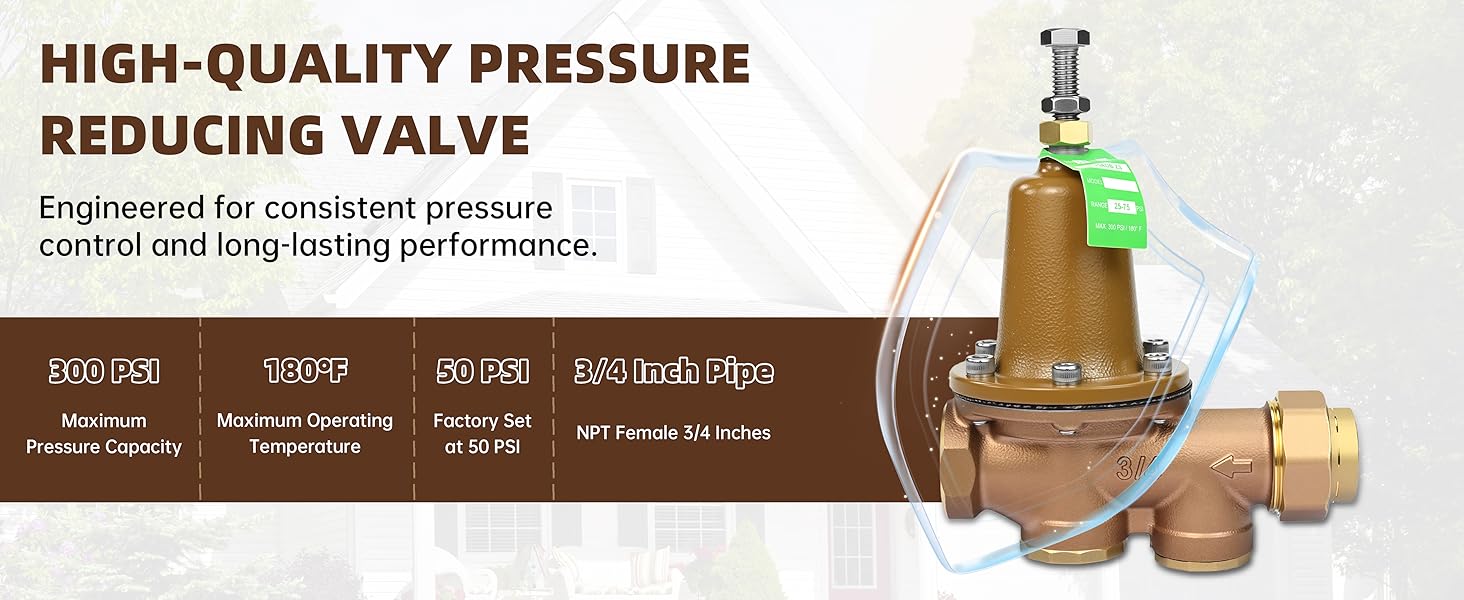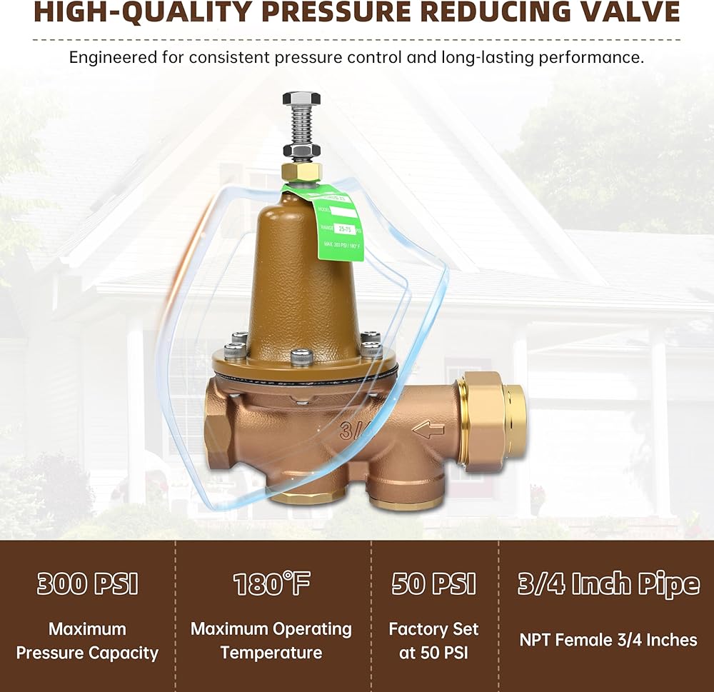 تحكم في الضغط قابل للتعديل 25-75 رطل لكل بوصة مربعة: يسمح صمام تقليل الضغط بتعديل ضغط المخرج بسهولة من 25 إلى 75 رطل لكل بوصة مربعة ويأتي مضبوطًا مسبقًا في المصنع عند 50 رطل لكل بوصة مربعة للمساعدة في الحفاظ على ضغط المياه المنزلية المتوازن.