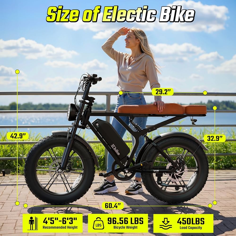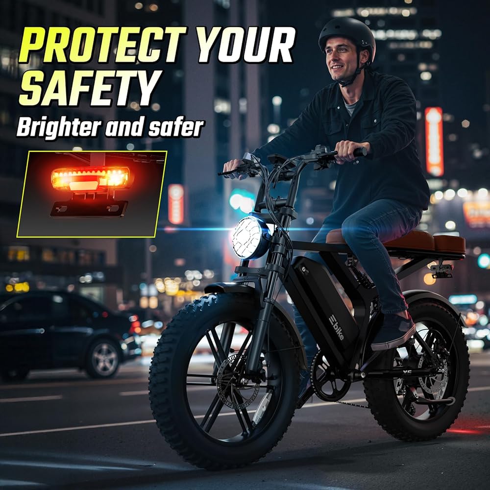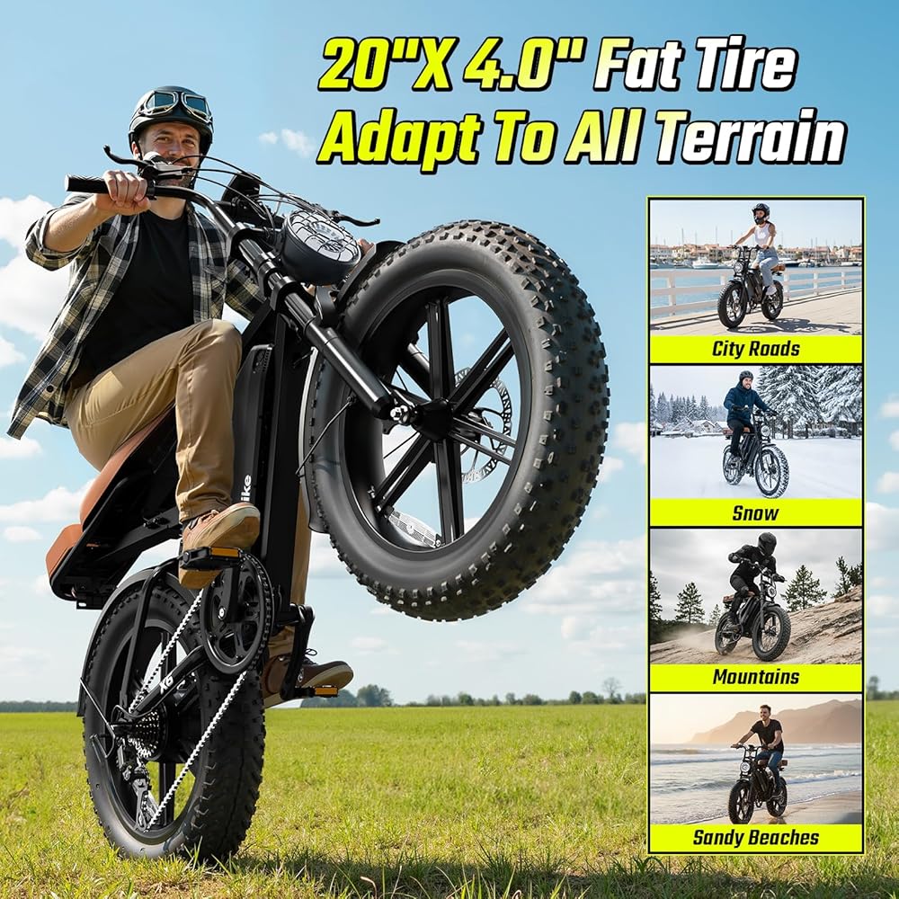 🚜 تصميم بإطار سميك مقاس 20 بوصة ومتعدد الاستخدامات لجميع التضاريس: تم تصميم دراجتنا الكهربائية ذات الإطار السميك مقاس 20 بوصة لتحقيق الثبات والجر، وهي تتفوق على أي سطح - شوارع المدينة أو الشواطئ الرملية أو المسارات الصخرية أو الممرات الثلجية. تمتص الإطارات الدهنية الصدمات، وتعزز التحكم، وتوفر قيادة مريحة وآمنة. سواء كنت تتنقل أو تسير على الطرق الوعرة، تتكيف هذه الدراجة بسلاسة مع نمط حياتك.