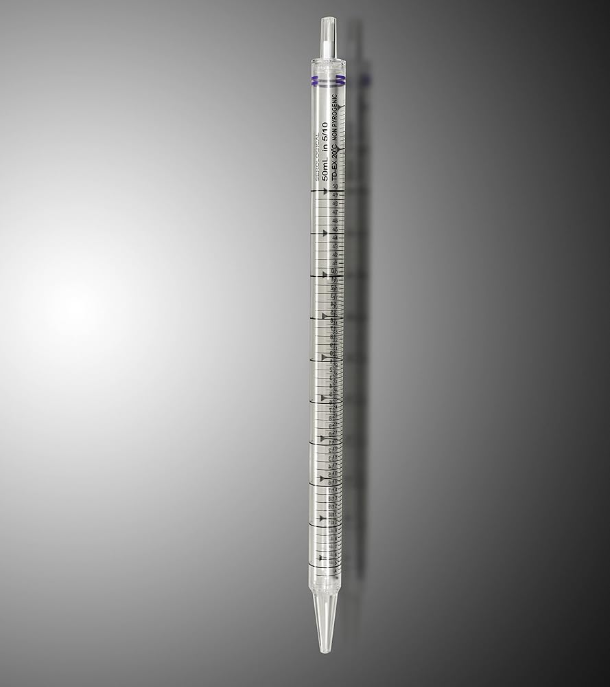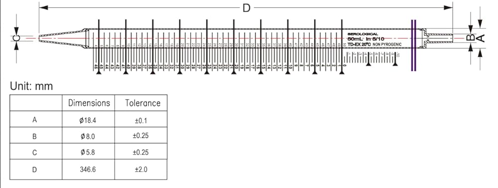 EarthOx's Disposable Sterile Serological Pipettes 50ml are calibrated for accurate dispensing to within ±2%. Its bidirectional graduations on the pipettes provide added applicability. The pipettes are sterile and non-pyrogenic. Volume: 50 ml. Graduations: 5/10ml. length: 346mm ±2mm. Negative Graduation: -10ml. Color code: Purple. Material: Polystyrene. Sterilized Package: Paper/Plastic ***FOR IN-VITRO LABORATORY RESEARCH USE ONLY**