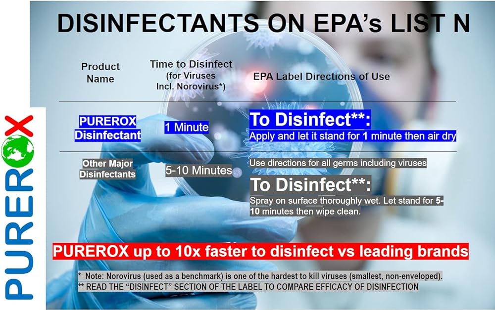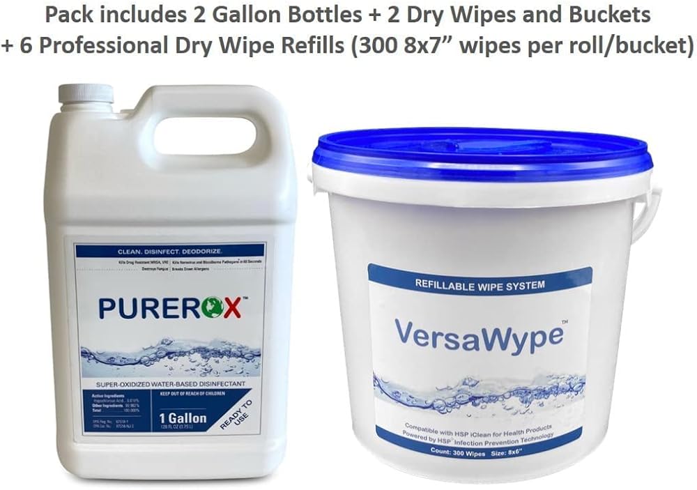 فعال: يقتل الفيروسات (99.9999%) في 60 ثانية في خطوة واحدة؛ الجراثيم والفطريات المقاومة للأدوية. إنه مدرج في قائمة وكالة حماية البيئة (EPA) N. يمنع نمو العفن والعفن الفطري المدمر. يزيل الروائح والمواد المسببة للحساسية. تتكون من 2 جالون من PUREROX، و2 دلاء قابلين لإعادة التعبئة (300 منديل جاف مقاس 8x6 بوصة لكل دلو) مناديل مبللة احترافية، و6 لفات إعادة تعبئة (300 منديل جاف مقاس 8x6 بوصة لكل لفة)