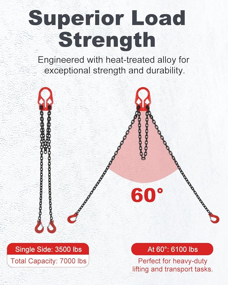 سعة تحميل عالية - كل سلاسل سحب مزودة بخطافات تدعم ما يصل إلى 3500 رطل، بسعة إجمالية تصل إلى 7000 رطل، أو 6100 رطل عند 60 درجة. مثالية لرفع ونقل البضائع الثقيلة في مجموعة متنوعة من الإعدادات