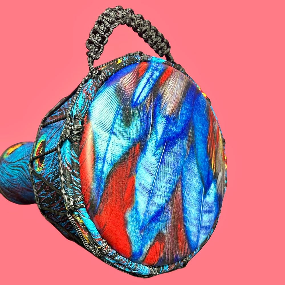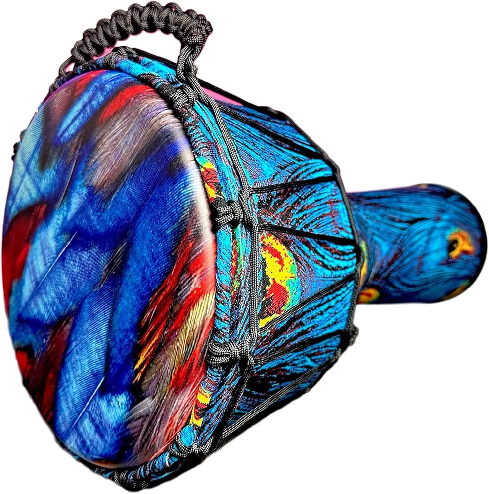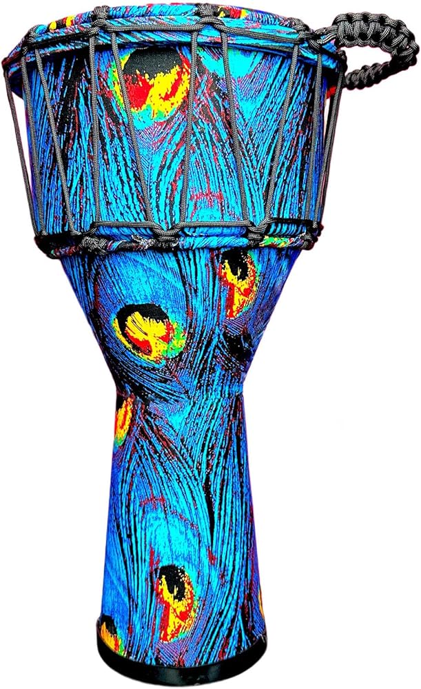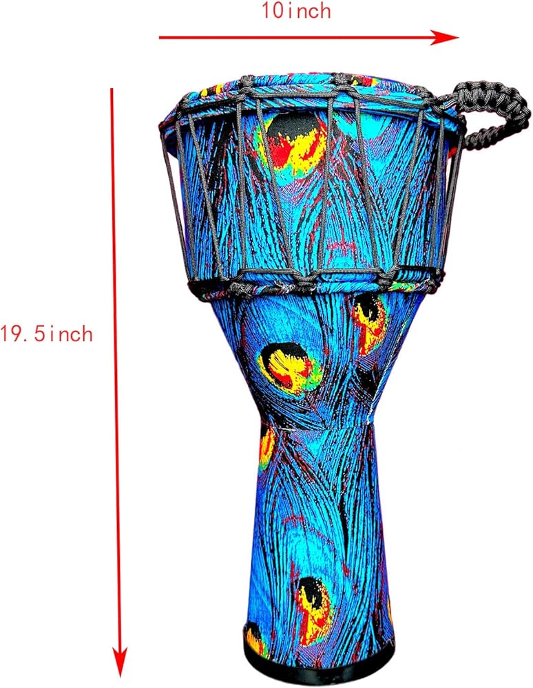 Immerse yourself in the vibrant rhythms of Africa with this stunning professional djembe drum, adorned with an eye-catching peacock feather design. The mesmerizing pattern features brilliant blues and purples swirling across the drum's surface, with striking yellow accents that mirror the natural beauty of peacock plumage. This percussion instrument combines traditional craftsmanship with artistic excellence, making it perfect for both performance and display. The drum's robust construction ensures rich, resonant tones, while the carefully tuned synthetic head provides consistent sound quality. The intricate rope tuning system allows for precise tension adjustment, enabling players to achieve their desired pitch and tone. Whether you're a professional musician, drum circle enthusiast, or collector of unique musical instruments, this djembe's exceptional sound quality and stunning visual appeal make it a remarkable addition to any percussion collection. Each drum features detailed handcrafted artistry, making every piece uniquely special.