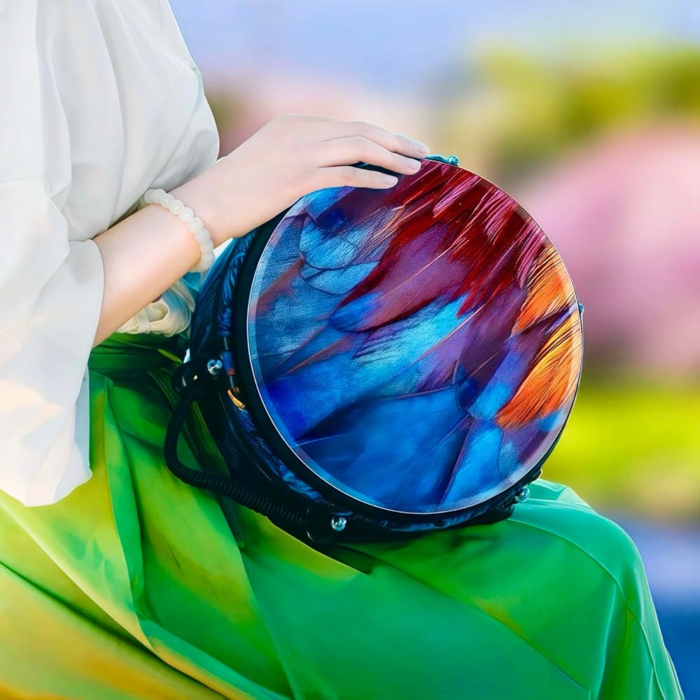 HANDCRAFTED DESIGN: Beautiful peacock feather pattern with vibrant blue and purple colors hand-painted on the drum body and head for stunning visual appeal