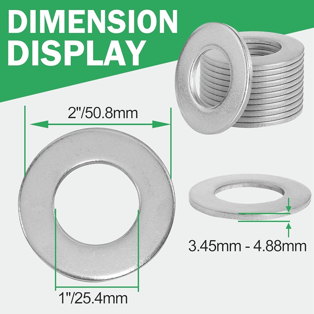 • EASE OF INSTALLATION: 10 x 1" flat washers in the package, ID is 1", OD is 2". With the standard hole diameter, our flat washers fit perfectly onto 1" screws and bolts. They can be easily installed with minimal effort, reducing your working time and increasing efficiency.