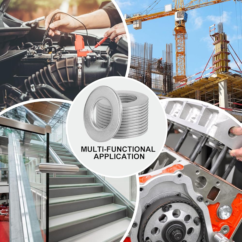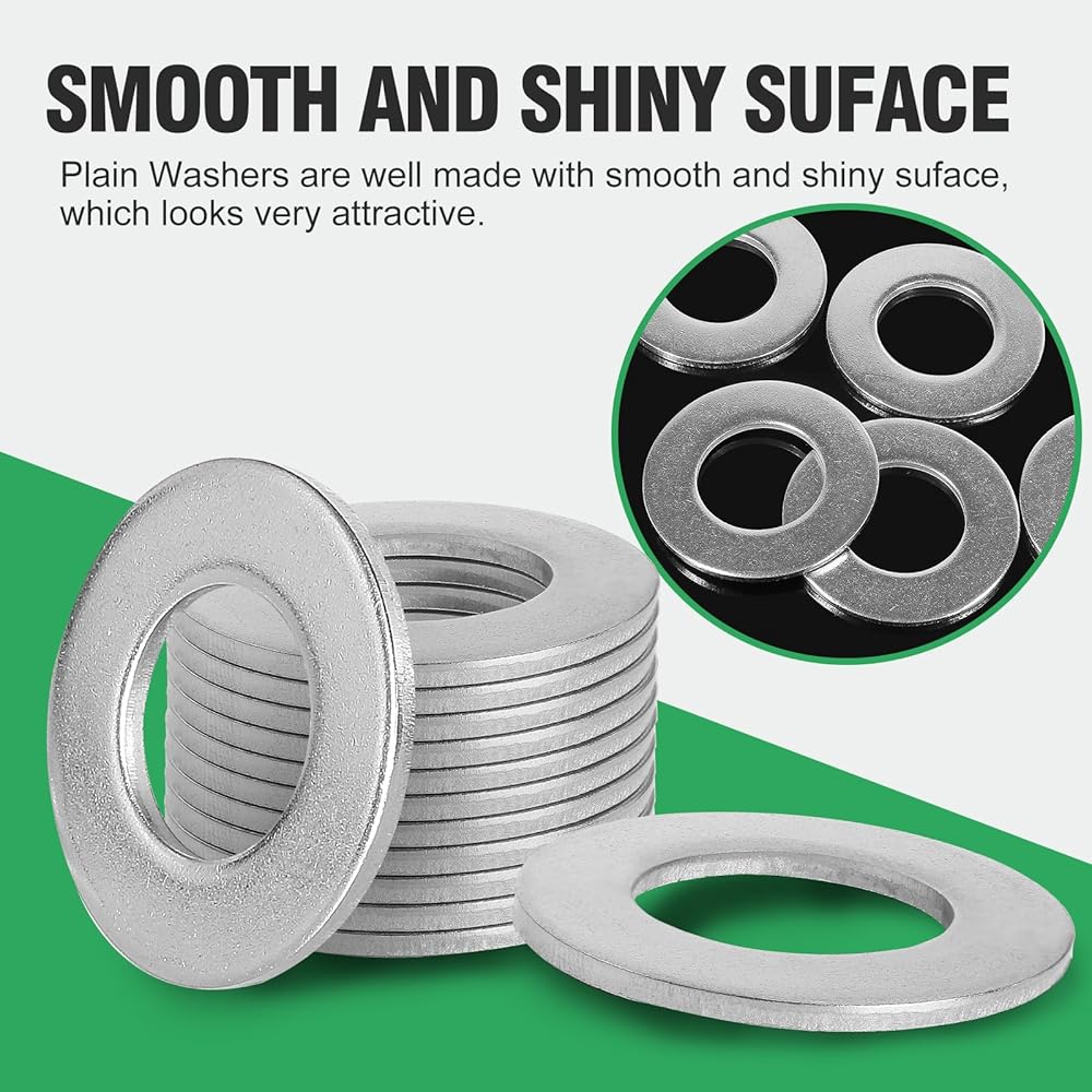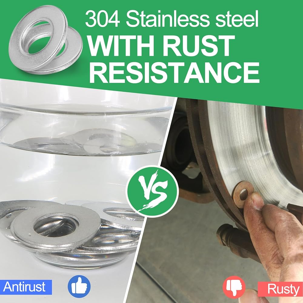 • HIGHT QUALITY MATERIAL: Each flat washer is precisely crafted, ensuring a perfect fit every time. Our washers are manufactured with 304 stainless steel materials and advanced machining processes, offering exceptional durability and resistance to wear and tear.