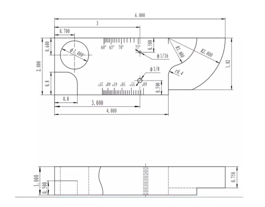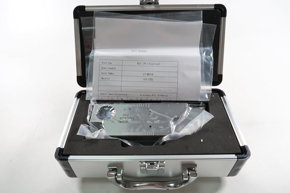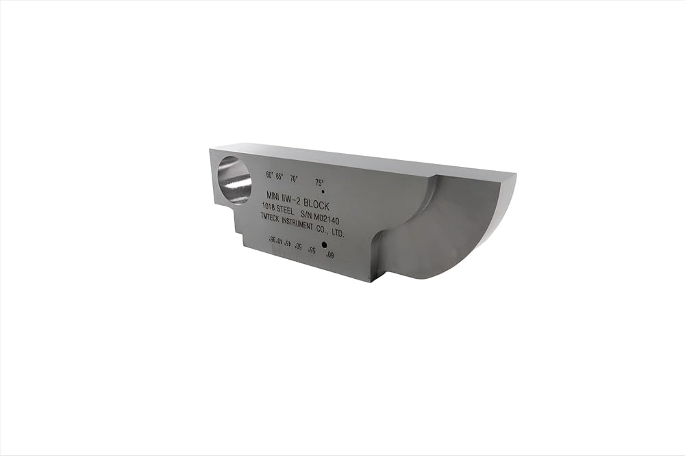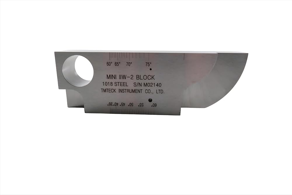 mini IIW-2 measures 1 thick x 2 tall x 6 long, and contains both 1 and 2 radii. Two sensitivity holes, one at 1/16, and one at 1/8 are located 0.500" from each scanning surface. A large 1.000" diameter through-hole is included, along with a convenient step measuring 0.500" thick in one corner. Angle beam exit markers from 35 to 75° are machine-engraved on one face. Don't miss that this block also includes three close-tolerance steps for thickness calibration. (0.500, 0.750, and 1.000”)