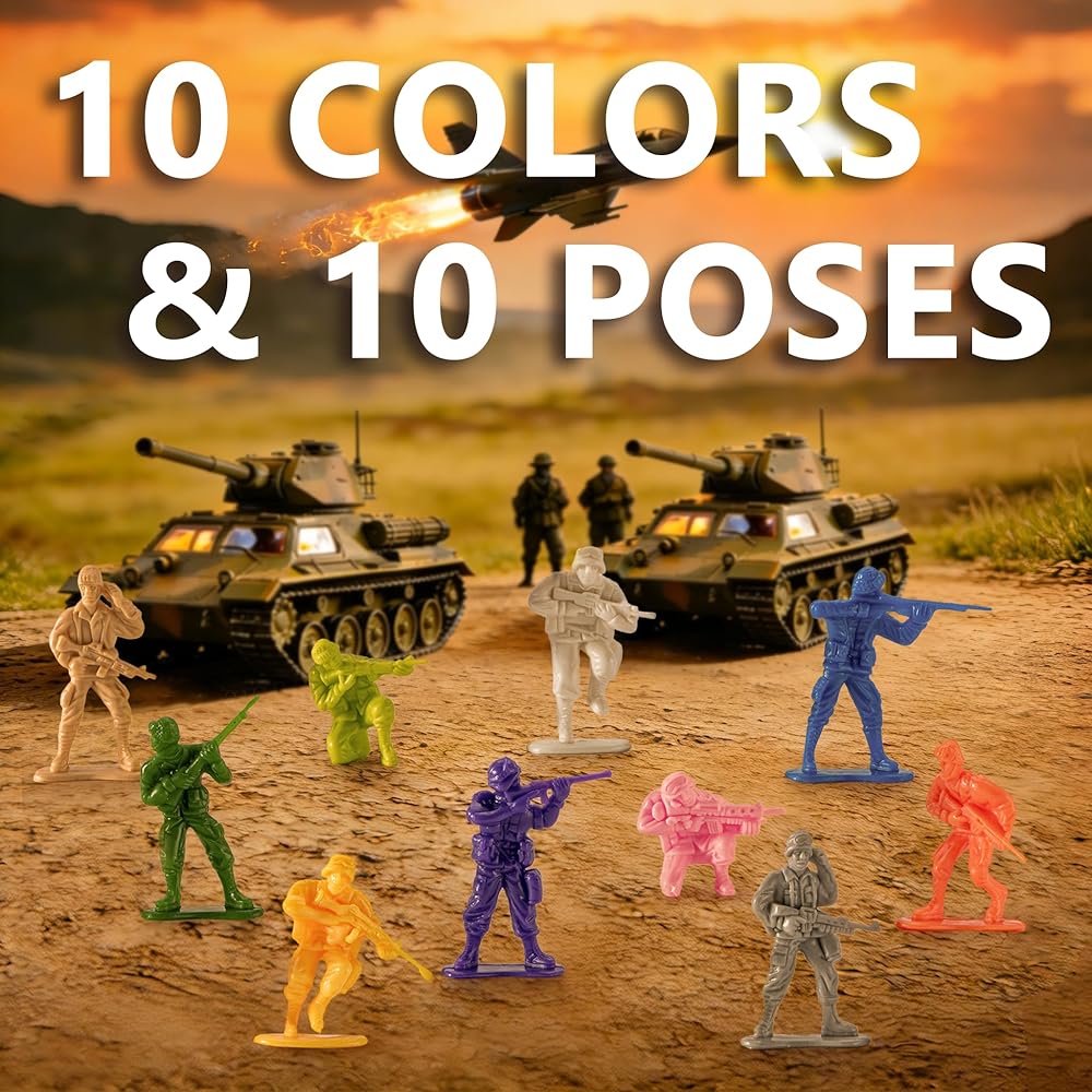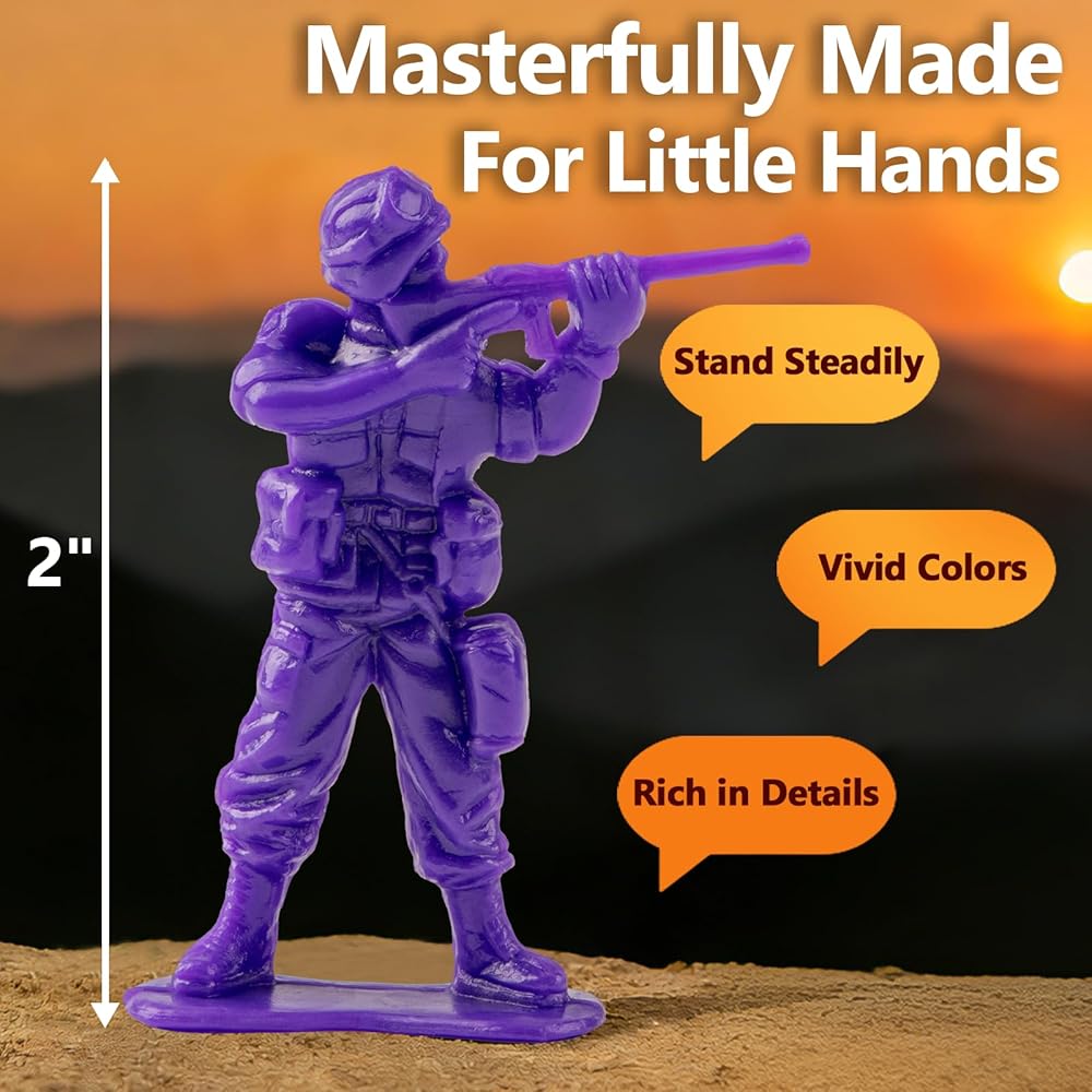Unlock a world of imagination with this classic set of 200 plastic army men! This bulk collection brings the timeless joy of toy soldiers to a new generation, featuring soldiers in 10 different colors—20 men per color. It's the perfect kit for epic battles, color-coded team strategies, or vibrant, hands-on play. Watch as your child's creativity takes command. They can sort by color, stage massive invasions, defend forts, or create elaborate scenes limited only by their imagination. This set encourages cooperative play, strategic thinking, and endless storytelling without the need for screens or batteries.