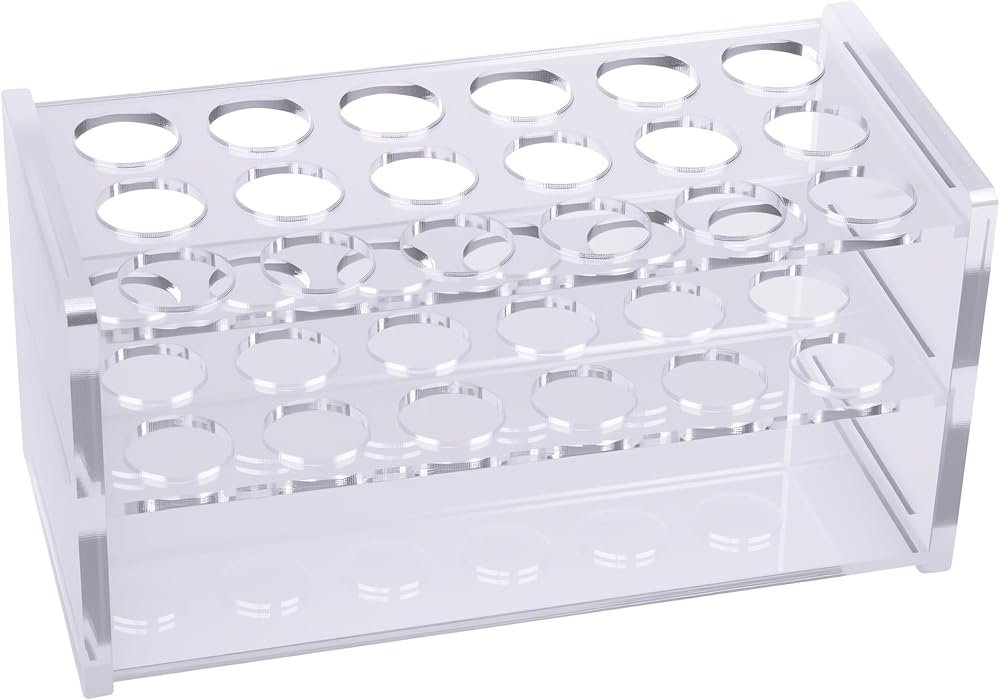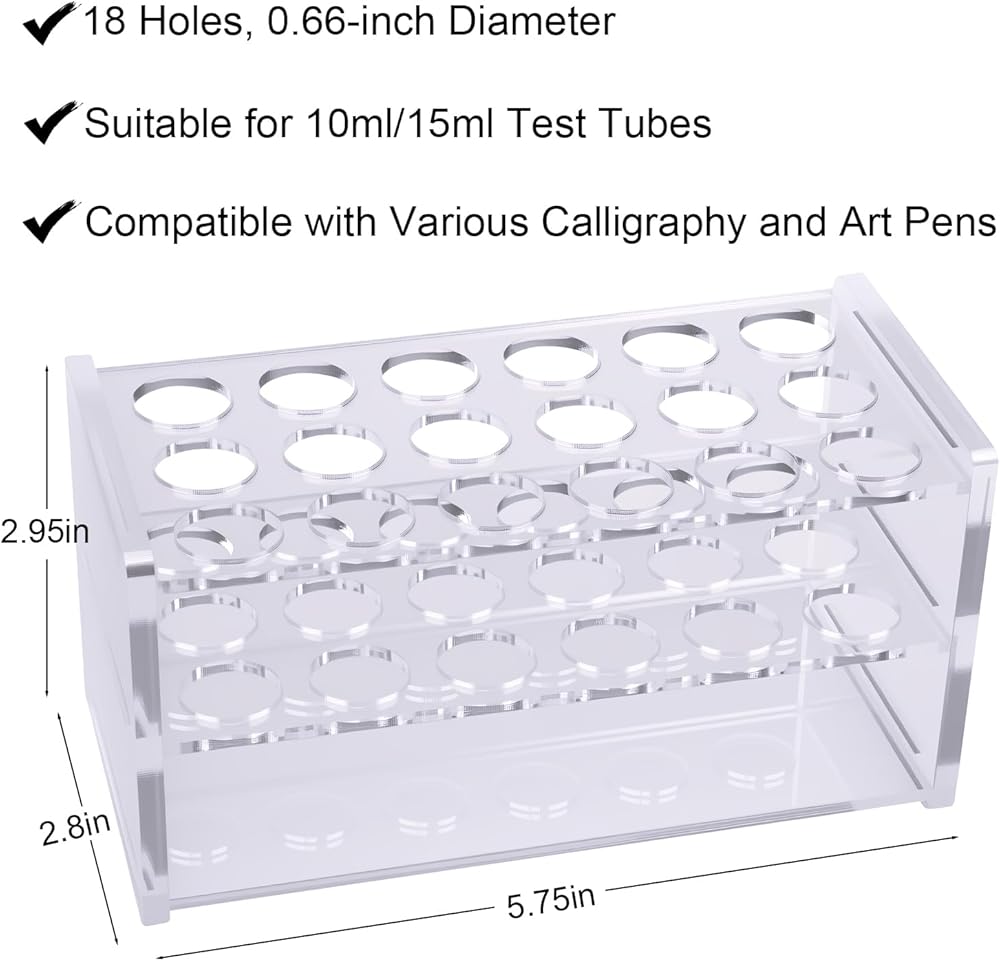 Featuring 18 precision-cut holes (17mm diameter), it is perfectly compatible with 10ml–15ml test tubes, centrifuge tubes, or even everyday items such as pens, gel pens, markers, and cosmetic vials. The transparent acrylic construction ensures you can easily view contents, labels, or liquid colors at a glance—boosting efficiency and convenience.