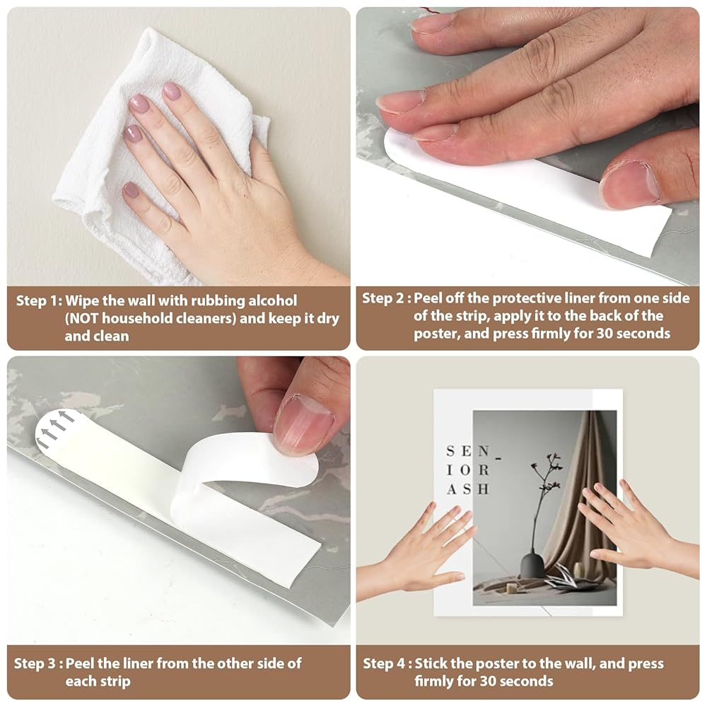 【Hang Pictures Without Nails】Picture-hanging strips work on smooth surfaces—glass, tile, metal, marble, finished wood, painted walls. No nails or tools needed! Not for wallpaper, fabric, brick, or rough/ textured surfaces.