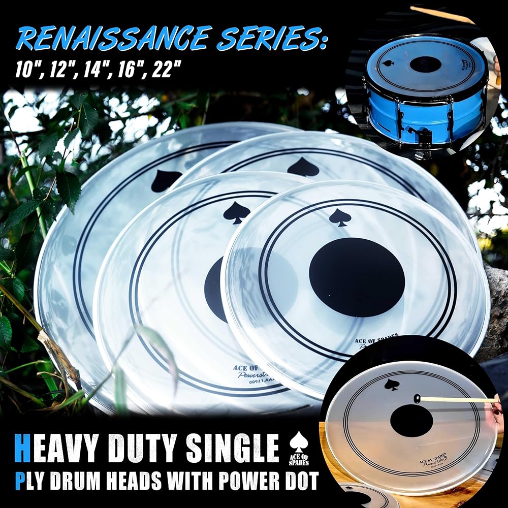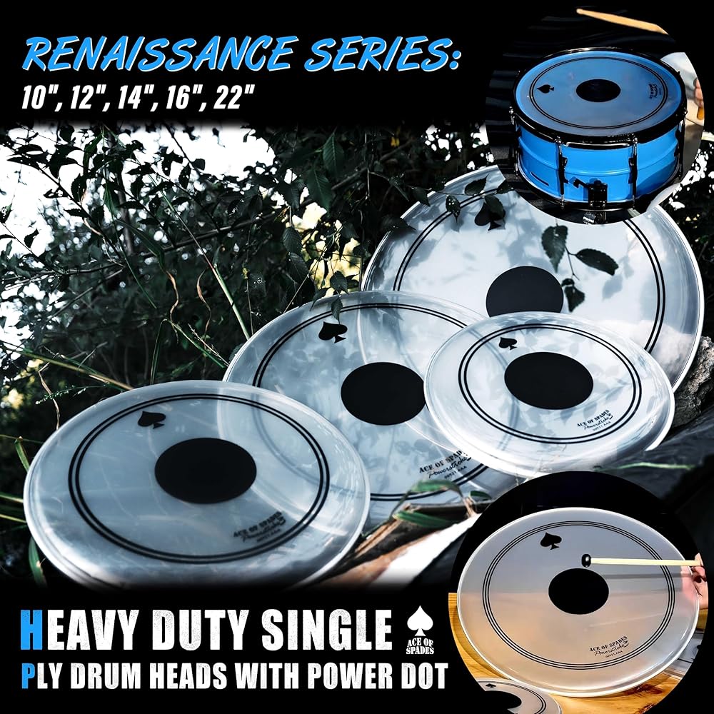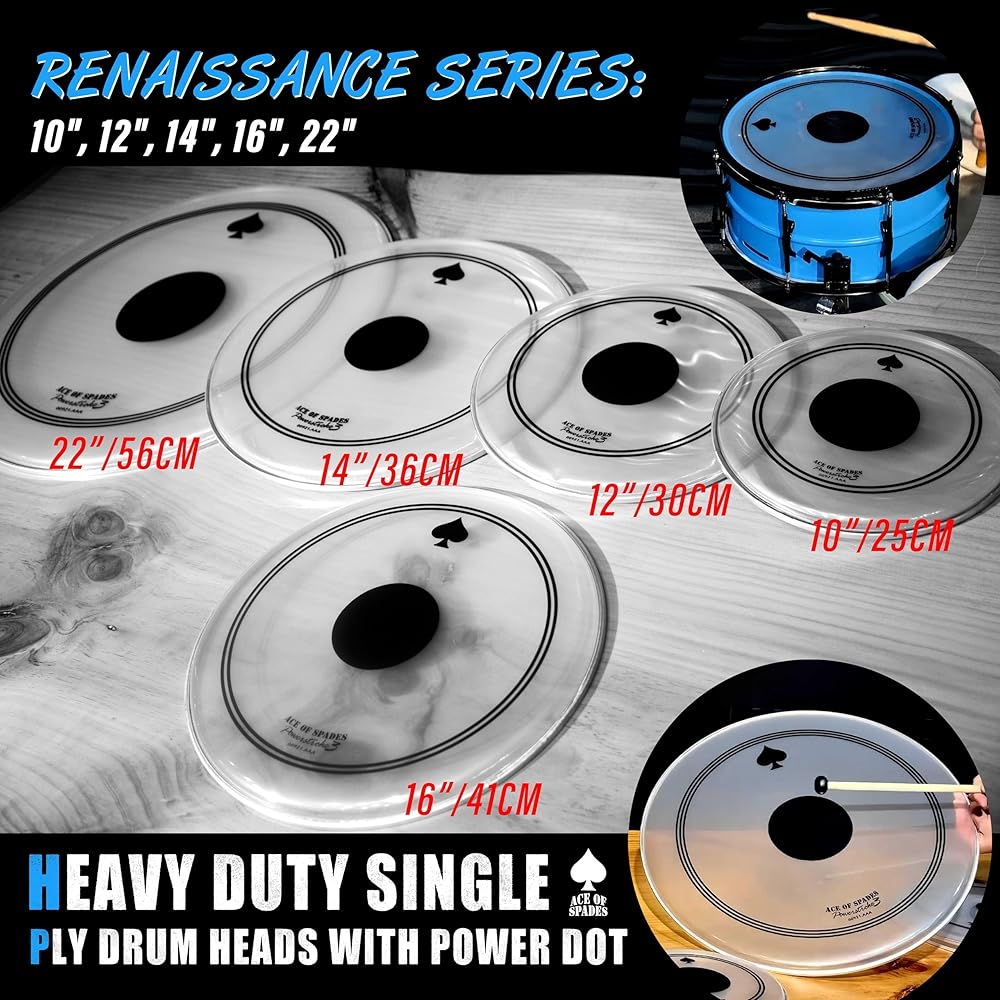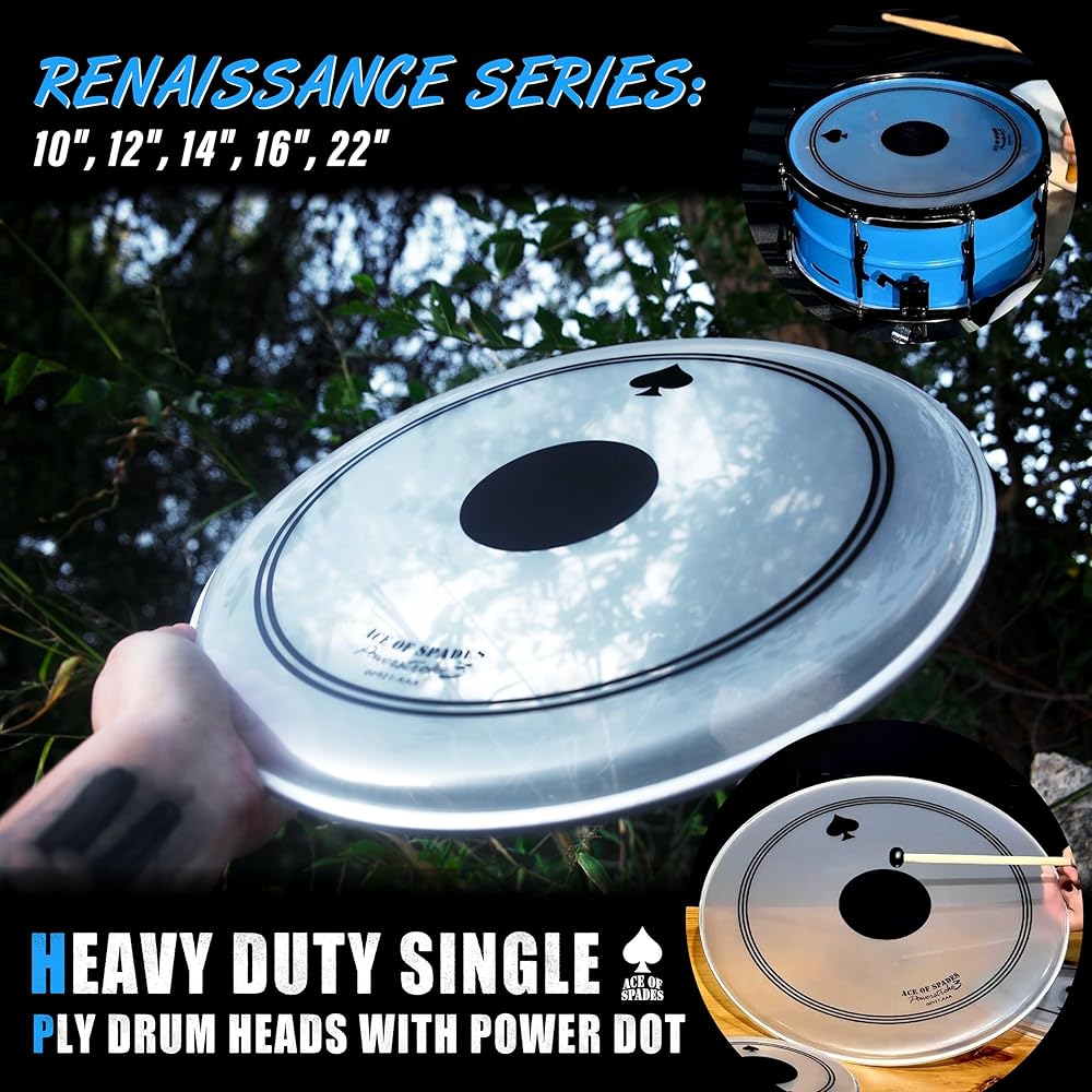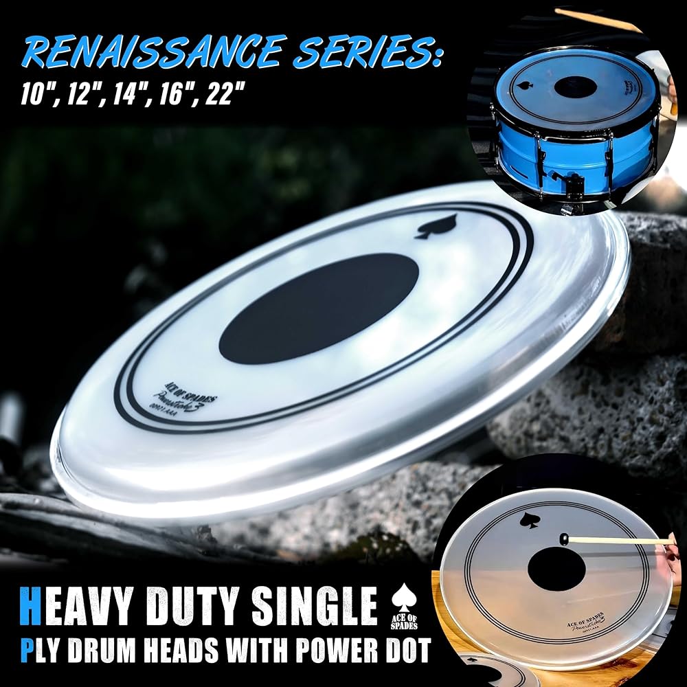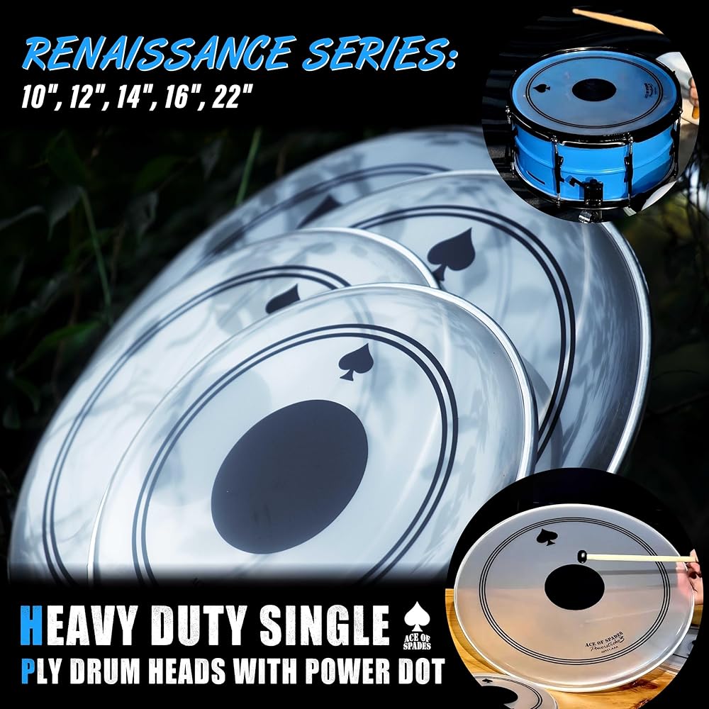 • ⚫【Black Reinforcement Dot – Double Durability + Deeper Low-End】: At the core of the Renaissance series is the integrated black reinforcement dot (0.28mm PVC patch). It strengthens the strike zone, prevents dents, and delivers even deeper, punchier lows on top of the already powerful bass response. Compared to standard single-ply heads, service life is doubled (2x durability)—so you can play harder and longer without worry.