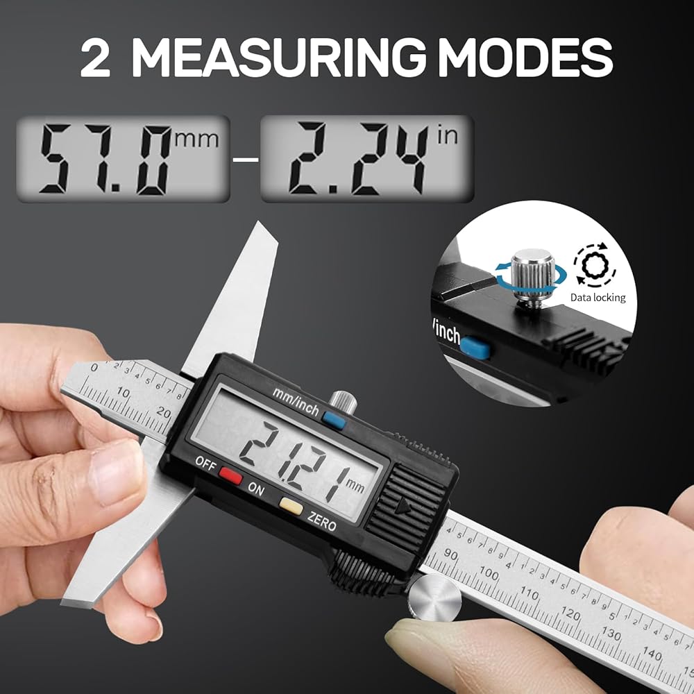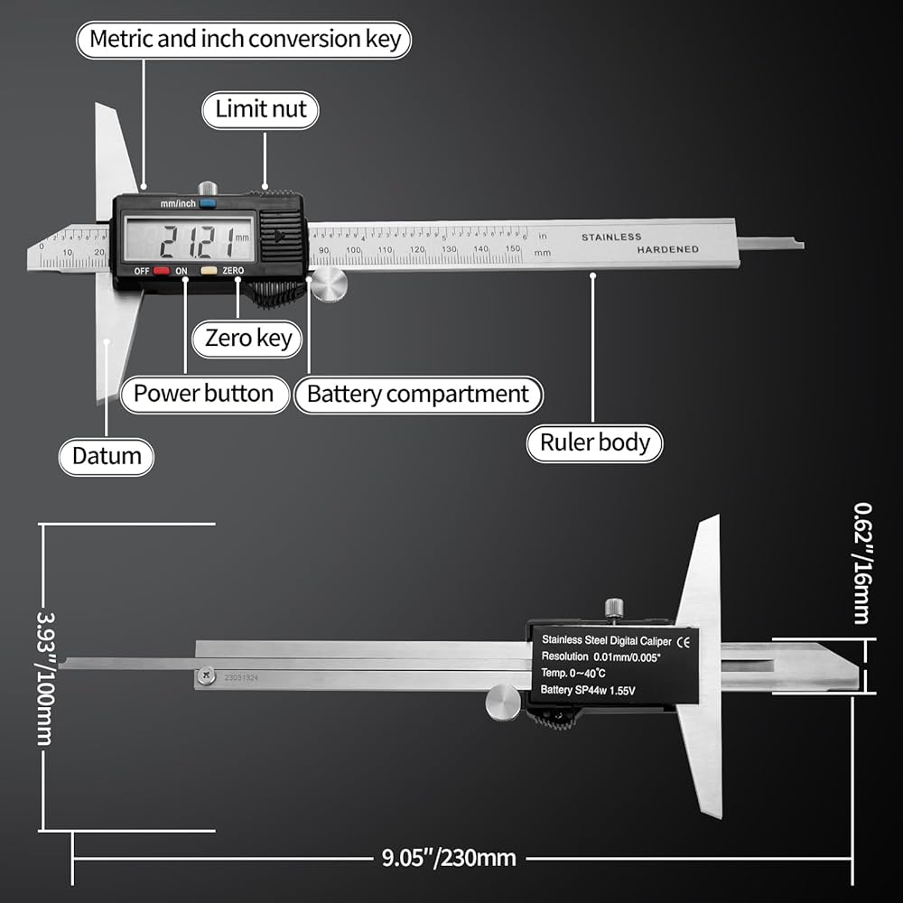شاشة رقمية سهلة الاستخدام: مع الفرجار الرقمي الذي يتميز بواجهة قراءة واضحة، يضمن مقياس العمق الخاص بنا عرضًا سريعًا ومباشرًا للقيم المقاسة، مما يقلل من خطر أخطاء السرعة الزائدة أثناء الاستخدام.
