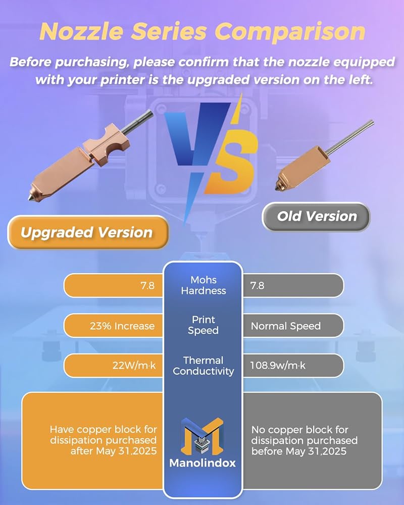 Compatibility: 0.25MM quick-detachable nozzle for Flashforge AD5X 3D printer. compatible with various mainstream filaments such as PLA, PETG, ABS, TPU and nylon. NOTE: The upgraded nozzles are only suitable for AD5X printers manufactured after May 31, 2025. when installing on an older version of the printer, you will need to upgrade the screws and heat sink (the new upgraded nozzle has physical differences from the old connector, and forced installation may cause deformation of the hot end module)