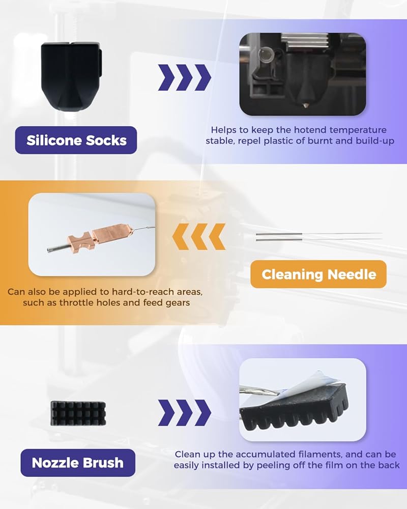 Installation and Matching: The for AD5X quick-release nozzle kit is easy to install and allows for direct replacement. you will receive 1Pcs 0.25mm nozzle, 5Pcs cleaning needles, 2Pcs nozzle brushs and silicone socks. this set is fully functional, allowing you to deal with various problems and enjoy the fun of DIY. if you have any questions, please leave a message on Amazon