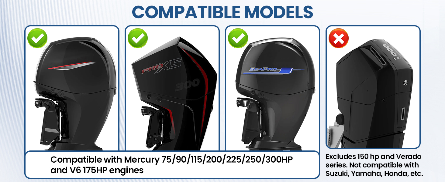 【توافق مثالي】موفر كامتالي ترانزوم، متوافق مع محركات Mercury 75/90/115/200/225/250/300 HP SeaPro رباعية الأشواط، ومحركات Pro XS رباعية الأشواط، بما في ذلك محركات V6 175HP الجديدة، باستثناء سلسلة 150 HP وVerado. يرجى التحقق بعناية قبل الشراء